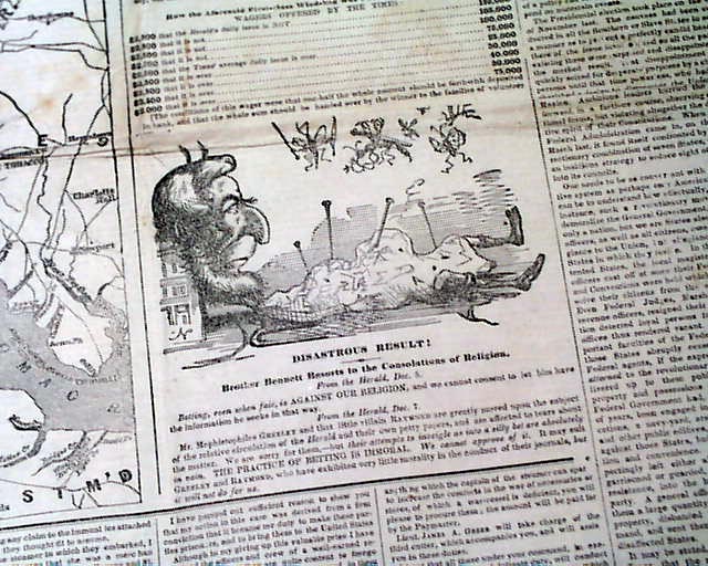 Secondly, there are two cartoons making fun of the newspaper's competition, the New York Herald, with the first showing: "Brother Bennett (Profanely Styled 'the Satanic,') Inflating his Well-Known First-Class, A No. 1 Wind-Bag, Herald." [James Gordon Bennett was publisher of the N.Y. Herald.], beneath which is a follow-up cartoon: "Disastrous Result!" showing the deflated balloon. This relates to the claims by the Times that the circulation of the Herald was not what they claimed.