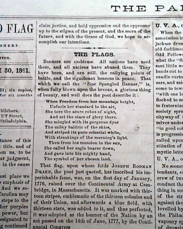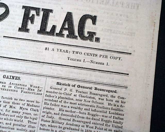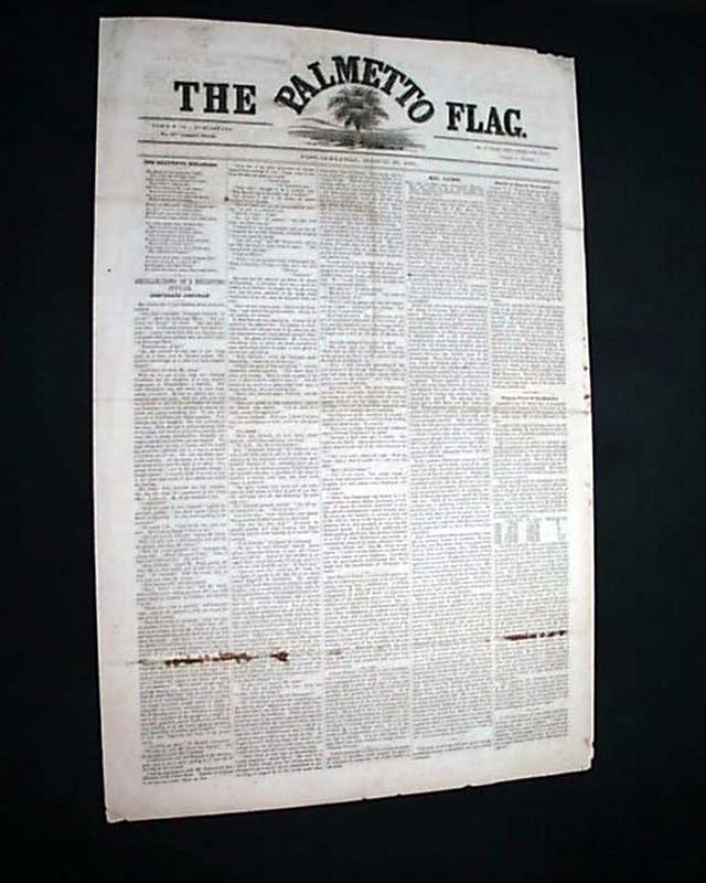 THE PALMETTO FLAG, Philadelphia, March 30, 1861 An exceedingly rare newspaper as only three issues were published, this being issue #1. This is just the second issue of this title we have encountered in our 50+ years.