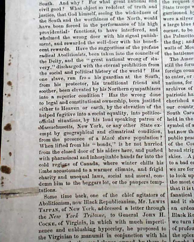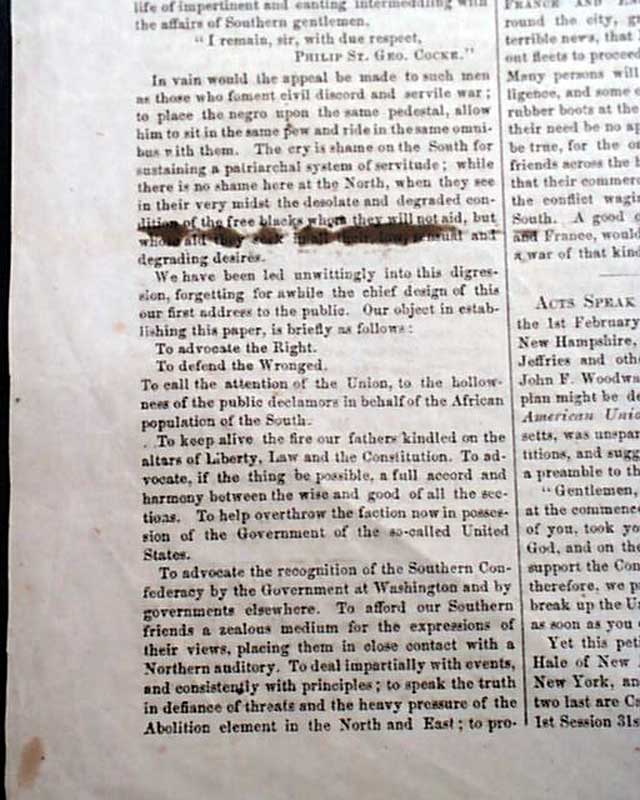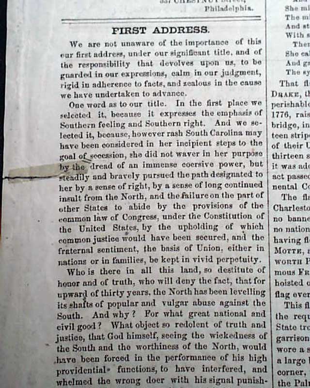 As the title might hint, this was a newspaper that sympathized with the Southern cause of the war which was just then beginning (Fort Sumter battle was April 12). It's title is a salute to South Carolina, the first state to secede from the Union. The content of this newspaper so incensed the people of Phil. that they mobbed the office and put it out of business with its April 13 issue.