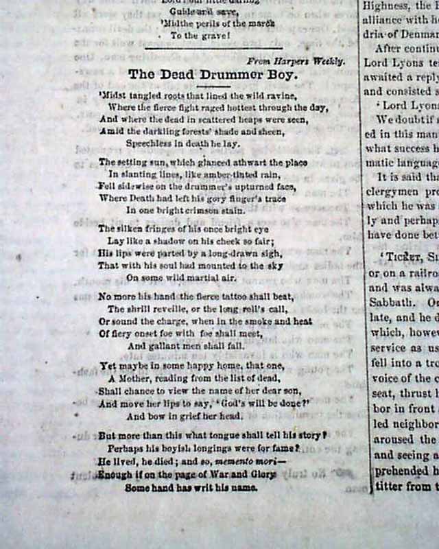 Among the articles are: "Stories of the President" "Our Prisoners" "A Pleasure Trip" "A Dangerous Game" and a poem: "The Dead Drummer Boy" and more.