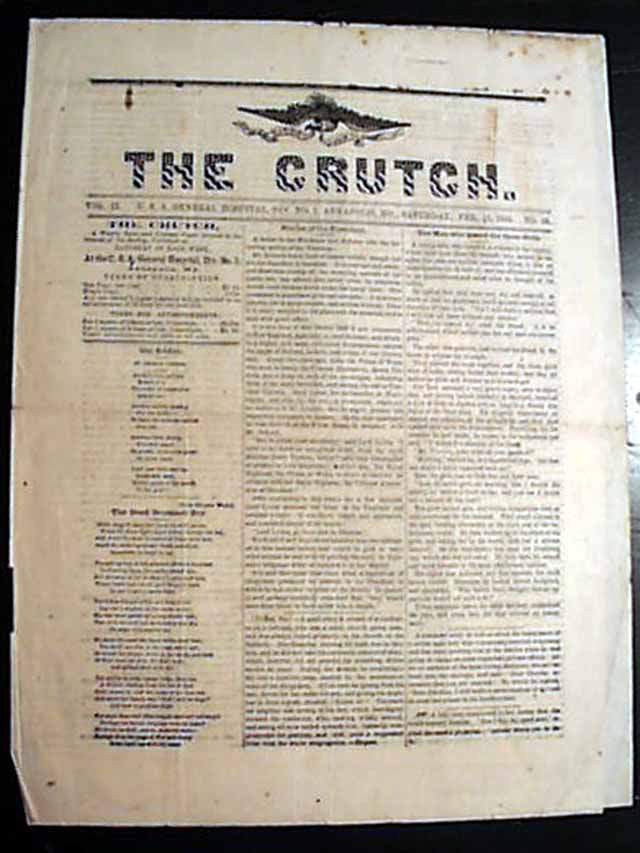 AI notes: The Crutch is considered a rare publication because it was a small, hospital-based newspaper with a very limited circulation, primarily intended for Union soldiers recovering at the U.S. General Hospital in Annapolis. Printed on inexpensive, fragile paper, most original copies did not survive, making existing issues uncommon and highly valued by collectors and historians. Edited by volunteer nurse Louisa Titcomb, the paper provided news, military updates, poems, stories, and morale-boosting content, reflecting both soldier life and the contributions of women in wartime nursing. Today, surviving issues are preserved in specialized collections such as the Maryland State Archives, where they are digitized to provide researchers and history enthusiasts access to this unique window into Civil War-era military hospitals.