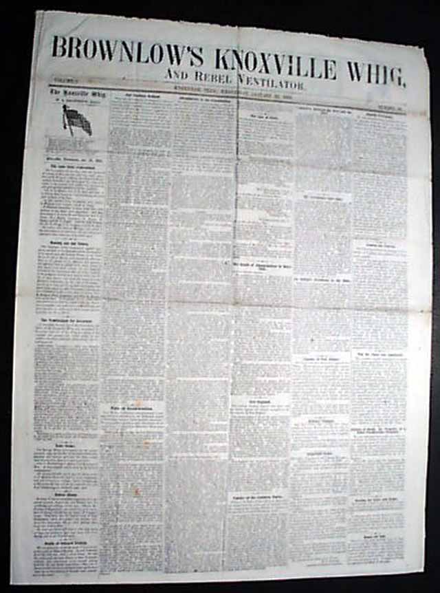 BROWNLOW’S KNOXVILLE WHIG, AND REBEL VENTILATOR, Tennessee, Jan. 25, 1865 W. G. Brownlow, or Parson Brownlow, was a fascinating personality to say the least. He regarded anyone who disagreed with him about religion or politics as an enemy. The circuit-riding Methodist parson turned to the press to spread his harsh anti-Presbyterian, anti-Calvinist rhetoric, and to spread his fervently held views on the inferiority of blacks & his unalterable opposition to secession. In 1861 Brownlow’s criticism of the Confederacy led the government to shut down his newspapers for 2 years. In December, 1861, Brownlow was arrested on a charge of high treason against the Confederacy. He spent much of 1862 touring the North giving pro-Union lectures & when he returned to Knoxville in 1863 the federal government provided him with a press, some type, $1500, & a government printing contract (credit Wikipedia). See the hyperlink for more on Brownlow.