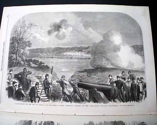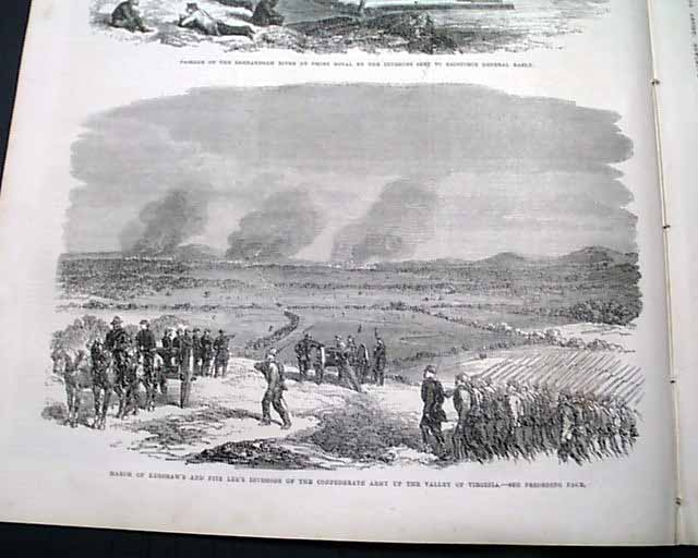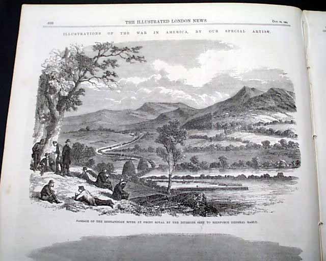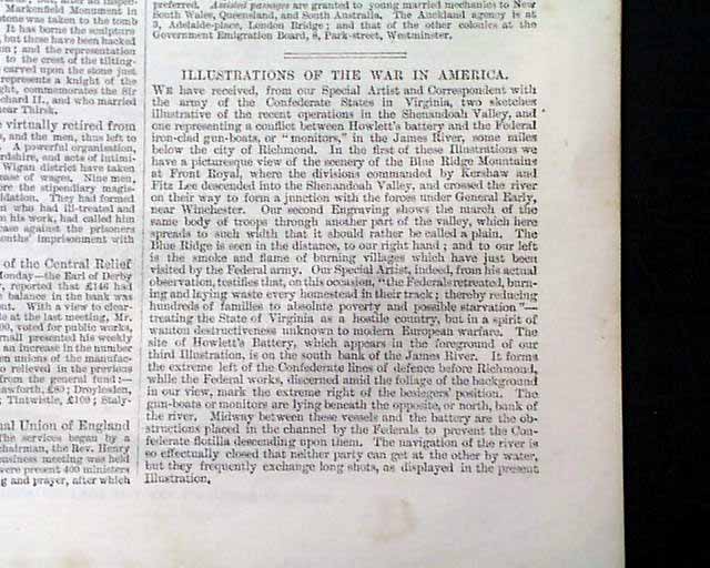 Inside has two full pages taken up with 3 prints: "Illustrations of The War In America", specifically: "Passage of the Shenandoah River at Front Royal..." "March of Kershaw's & Fitz Lee's Divisions of the Confederate Army up the Valley of Virginia" and: "Howlett's Battery on the James River, Engaging the Federal Monitors", with related articles.