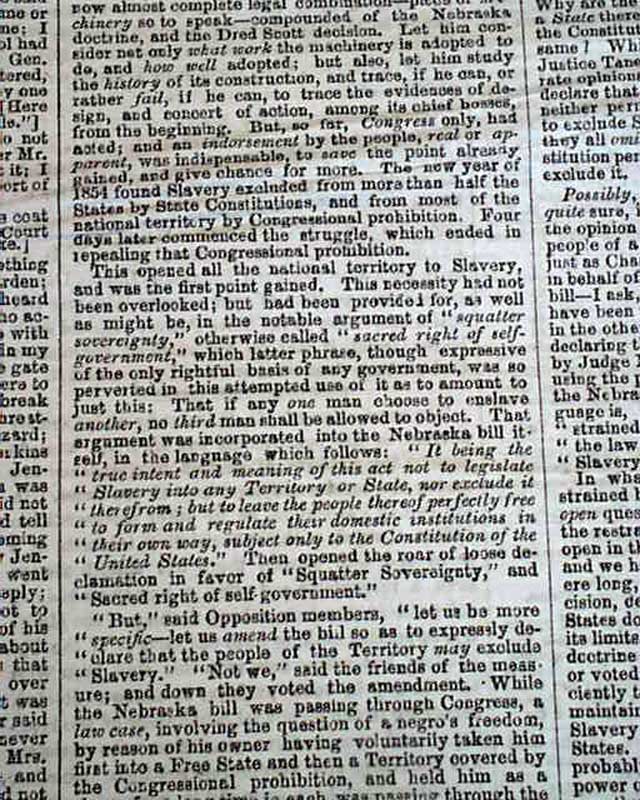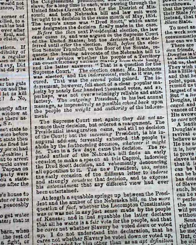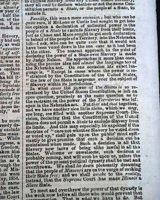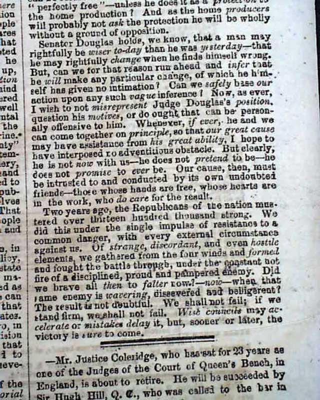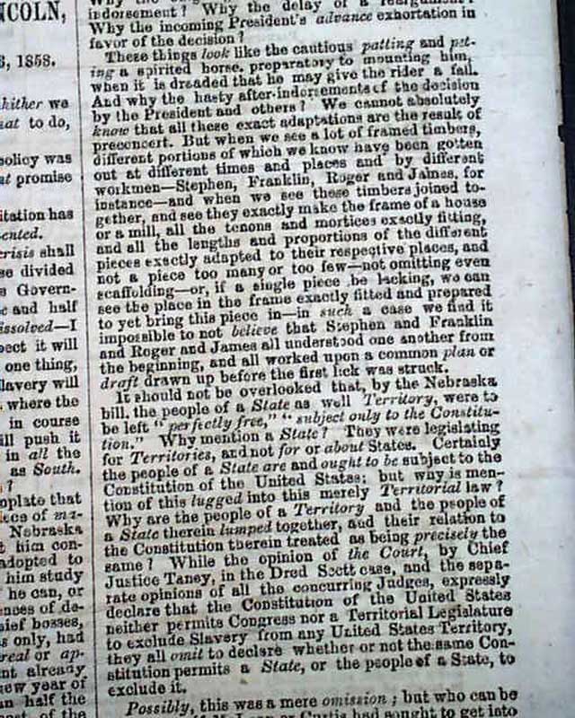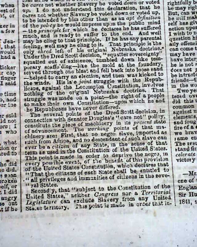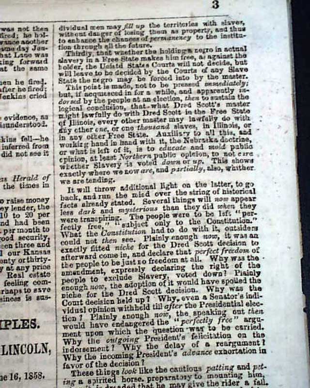 Of added significance is the editorial commentary found on page 4 and which takes one-third of a column. It begins: "We print elsewhere the compact and forcible speech of the Hon. Abraham Lincoln before the late Republican State Convention at Springfield, Ill, setting forth the distinctive position & views of the Republicans...as distinguished from those of Senator Douglas...Mr. Lincoln never fails to make a good speech..." with more.