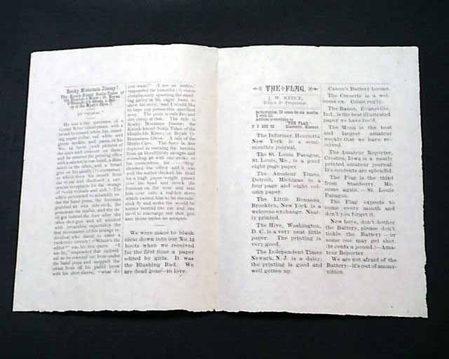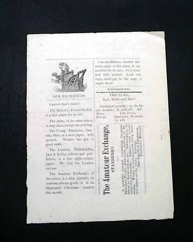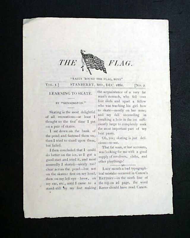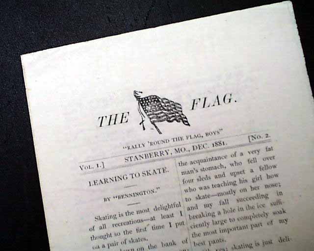 THE FLAG, Stanberry, Missouri, December, 1881 This tiny newspaper is part of the amateur press hobby that was very popular in the latter decades of the 19th century. Printed on small presses by amateur printers, the content was typically whimsical and very localized. This is the volume 1, number 3 issue. Most such newspapers had a very short life.