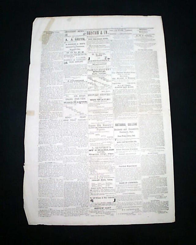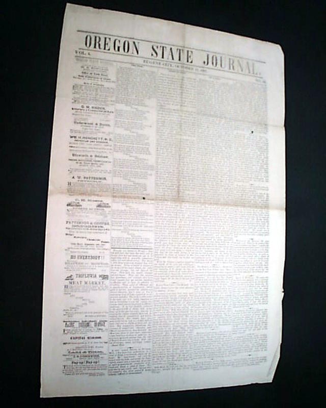 THE OREGON STATE JOURNAL, Eugene City, Oct. 12, 1867 This is one of the earliest Oregon newspapers we have offered. Typical news of the day and a wealth of advertisements. This was just 8 years after Oregon gained statehood.
