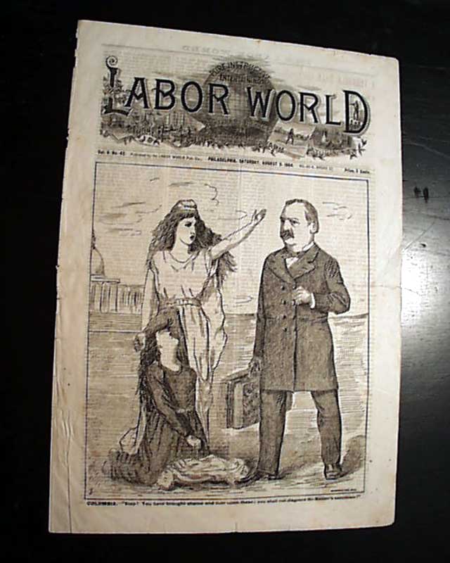 LABOR WORLD, Philadelphia, Aug. 9, 1884 This is a union-focused newspaper, in support of the working man. The full front page is a political cartoon showing "Columbia" and President G. Cleveland.