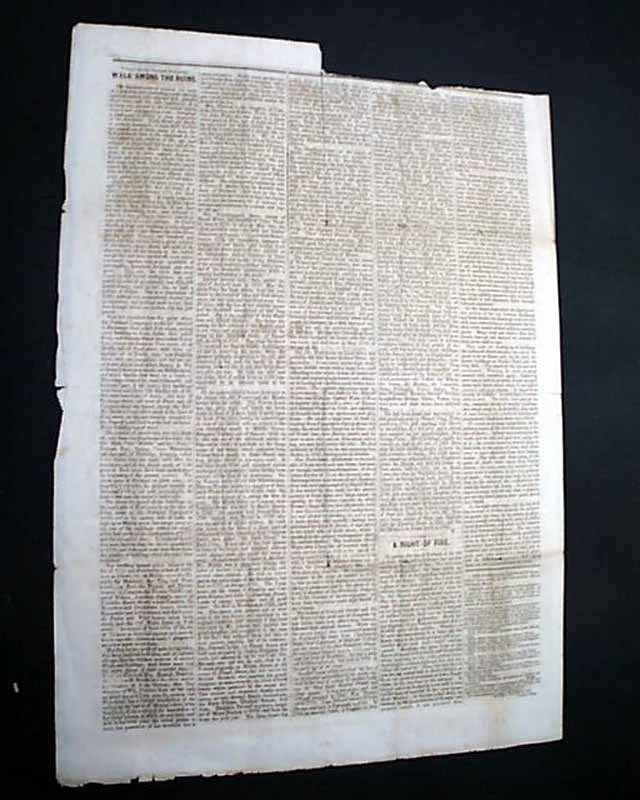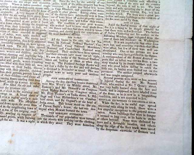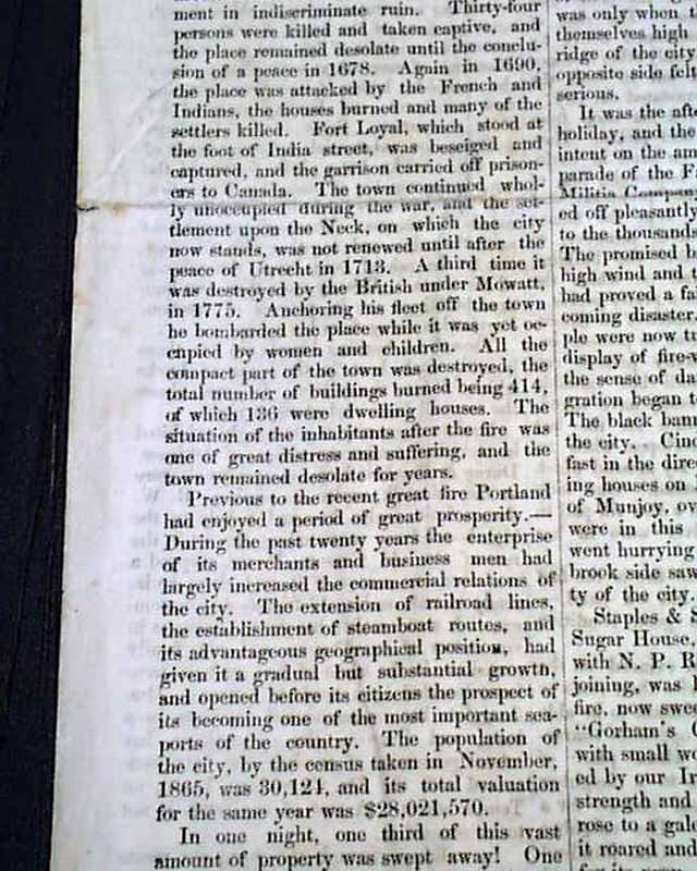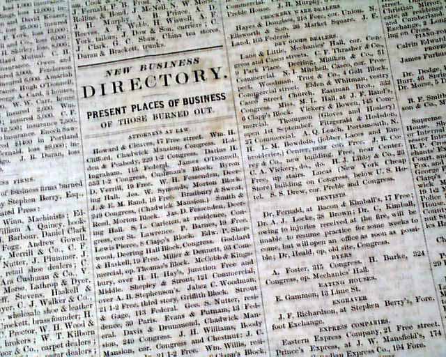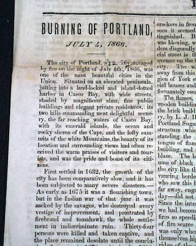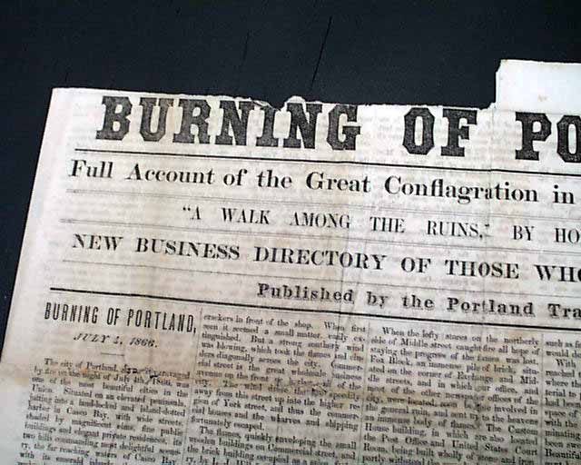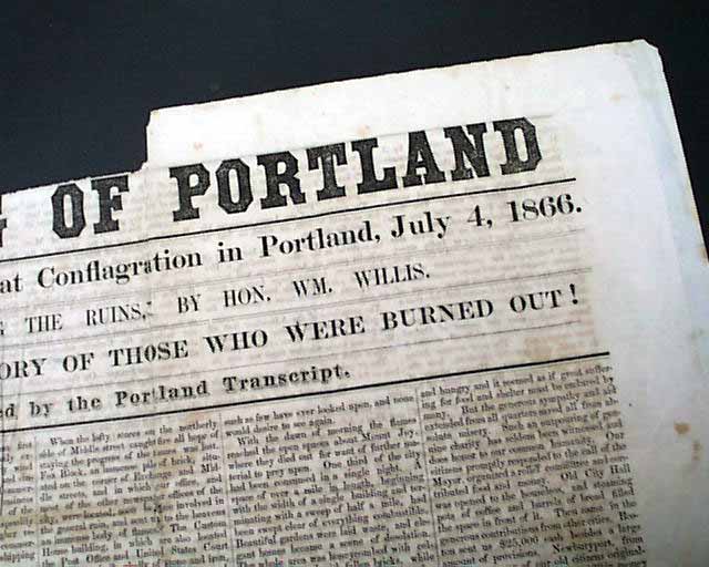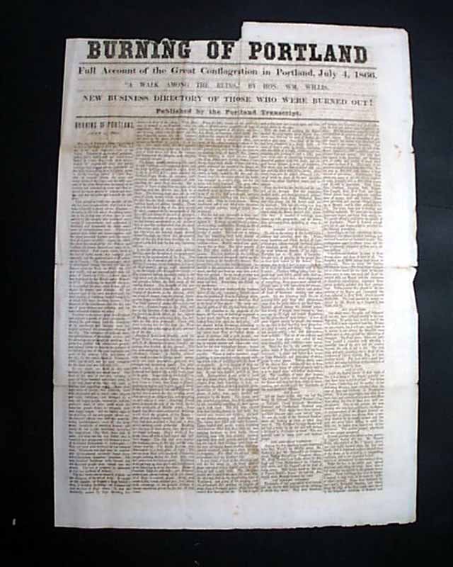 BURNING OF PORTLAND - Full Account of the Great Conflagration in Portland, July 4, 1866 - 'A Walk Among The Ruins, by Coin. Wm. Willis' 'New Business Directory of Those Who Were Burned Out! - Published by the Portland Transcript  This is a special four-page edition devoted to the Great Fire of Portland. There is no date of printing however one would suspect it was within a few days of the July 4 fire.