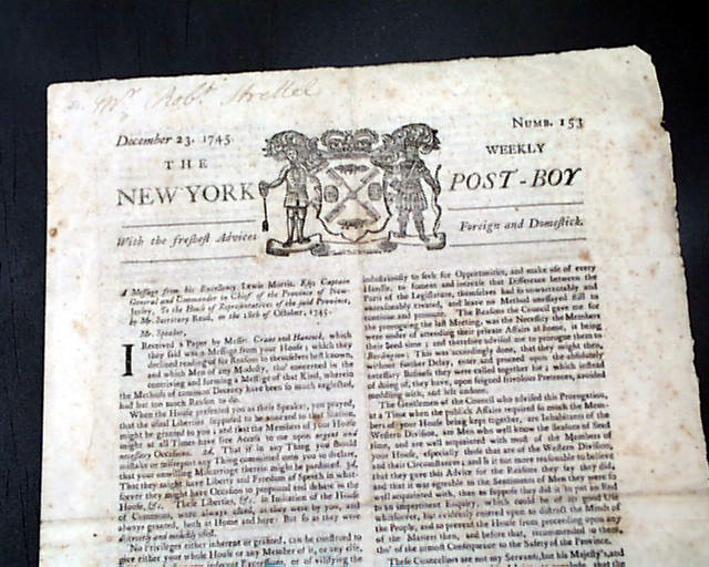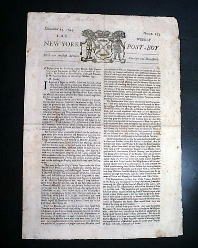 THE NEW YORK WEEKLY POST-BOY, Dec. 23, 1745  As those who follow our offerings know, it is rare that we have the opportunity to offer American newspapers from the 1740's. Here is a very handsome issue from 1745 featuring a nicely engraved, well-inked coat-of-arms engraving in the masthead.