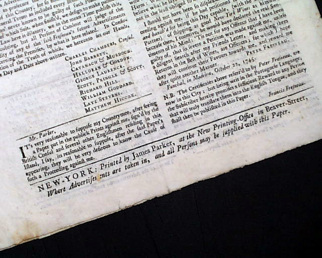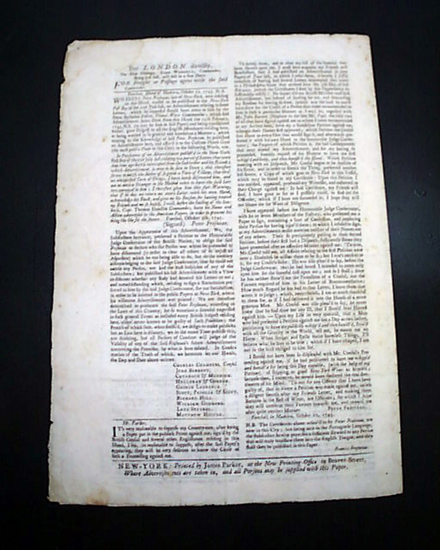 Handsome, colonial New York newspaper from 1743