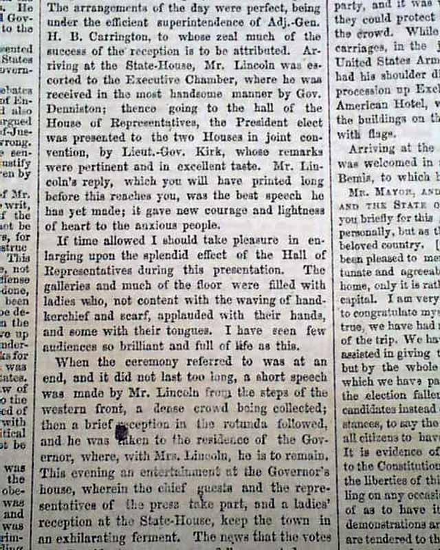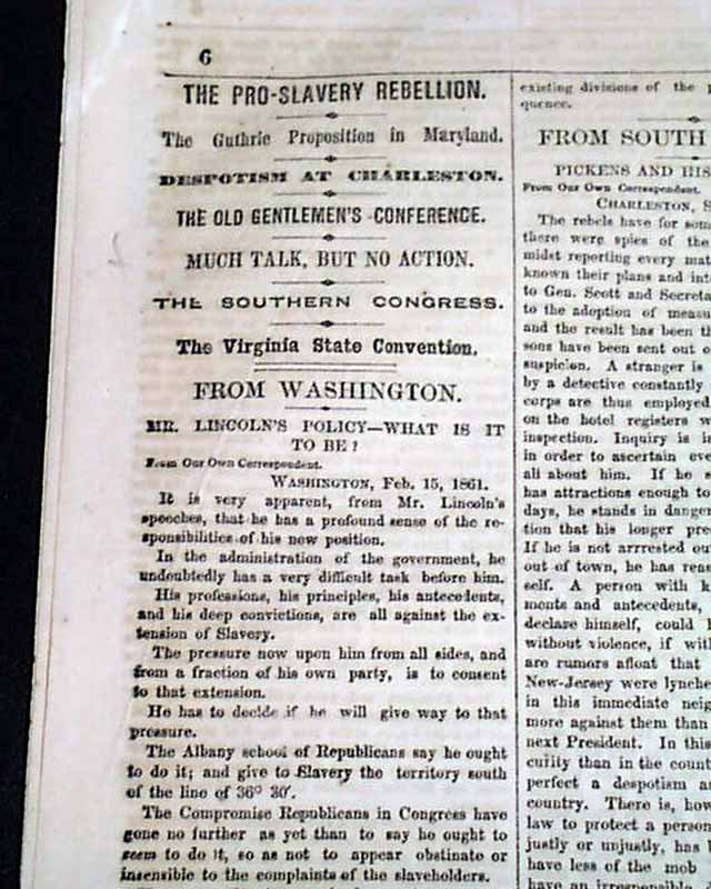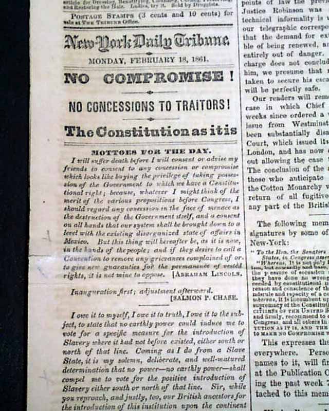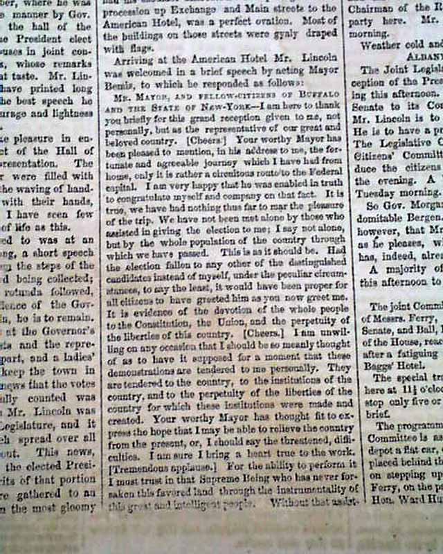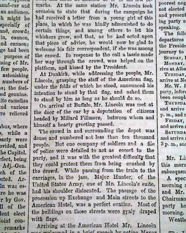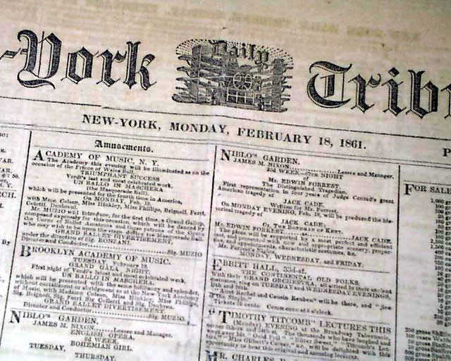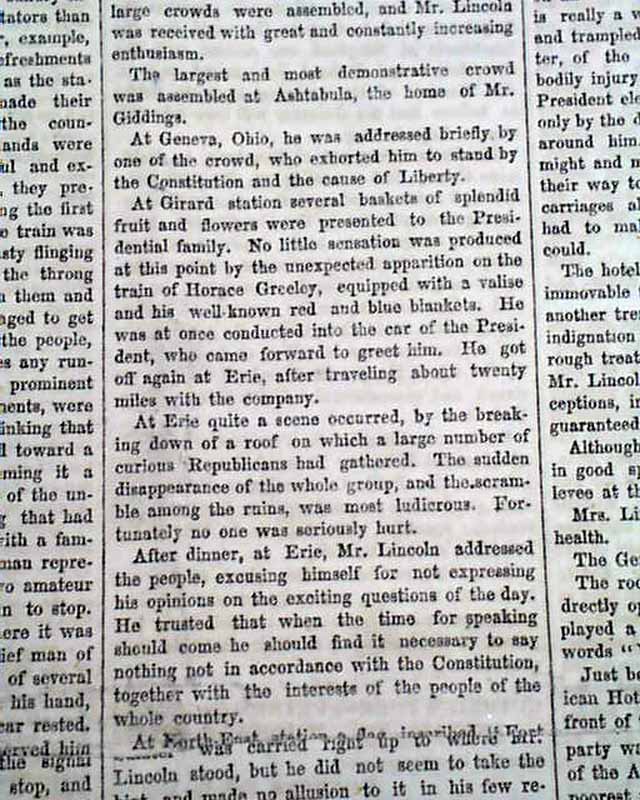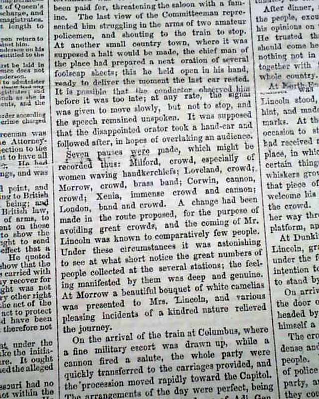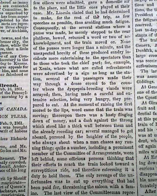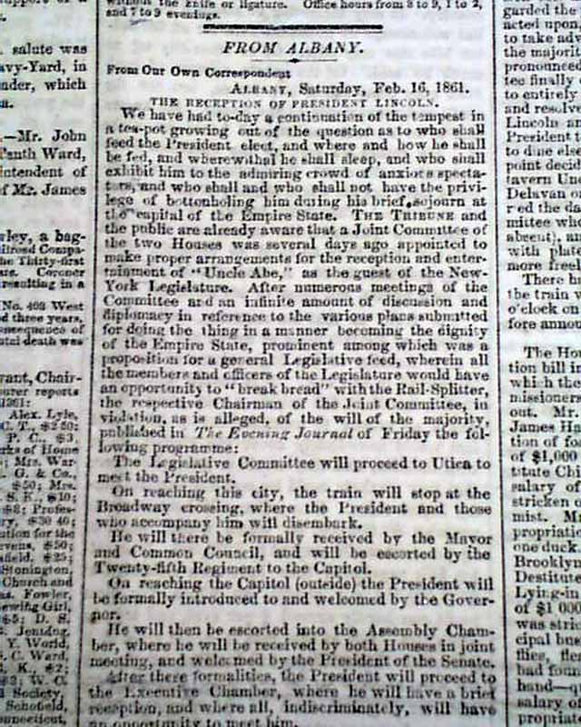 NEW YORK TRIBUNE, Feb. 18, 1861 Over half of page 5 is taken up with fine and detailed coverage of Lincoln's continued trip from his home in Illinois to Washington, D.C.