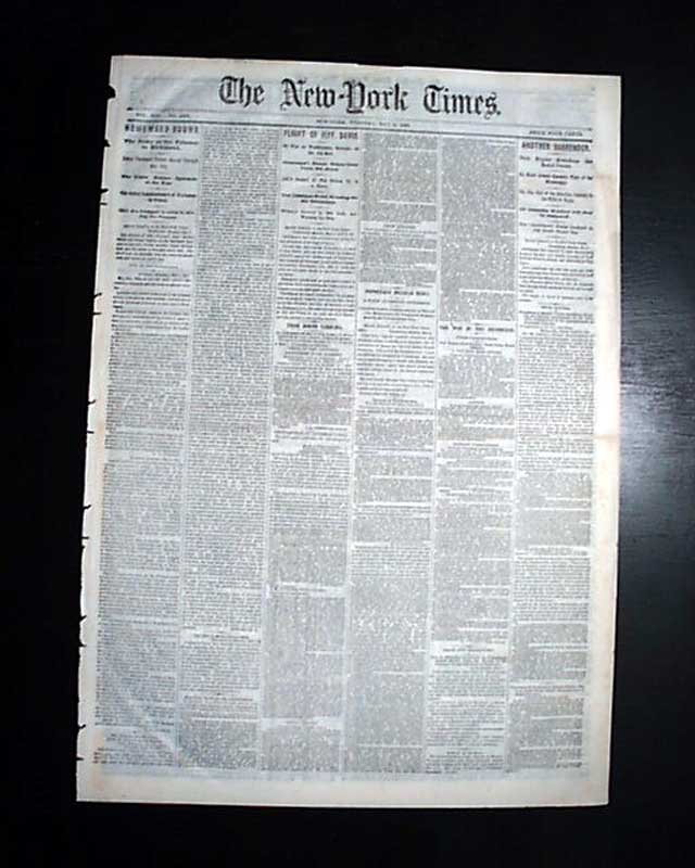 Among the front page column heads on the events immediately following the Civil War are: "HOMEWARD BOUND" "The Army of the Potomac in Richmond" "40,000 Heroes March Through that City" "FLIGHT OF JEFF. DAVIS" "He Was at Washington, Georgia, on the 4th" "Stoneman's Rough Riders Close Upon His Heels" "Jeff's Council of War Broken Up in a Hurry" "The Unhappy Rebel Heading for the Mississippi" "ANOTHER SURRENDER" "Dick Taylor Abandons the Rebel Cause" and much more.