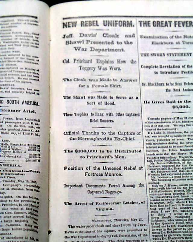 Additionally, page 5 has: "NEW REBEL UNIFORM" "Jeff Davis' Cloak & Shawl Presented to the War Dept." "Col Pritchard Explains How the Toggery Was Worn" "The Shawl was Made to Serve as a Sort of Hood" and more on the capture of Davis.