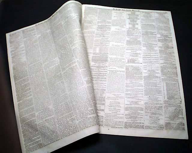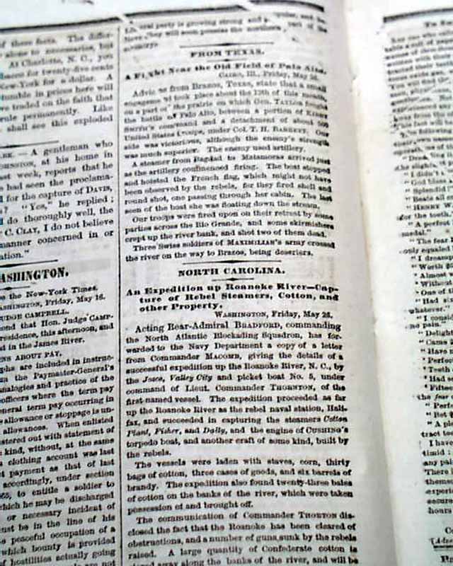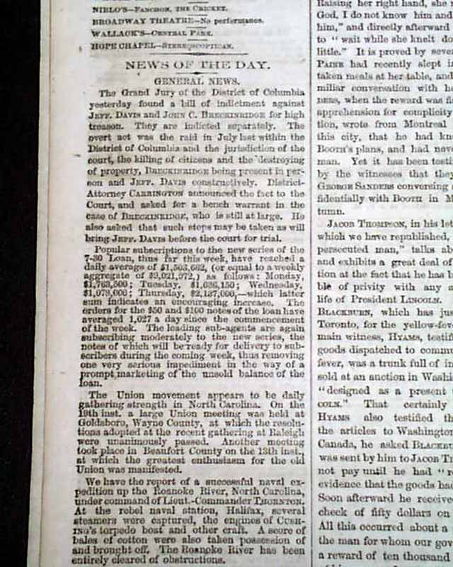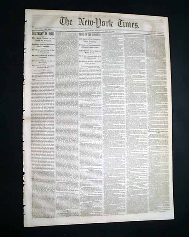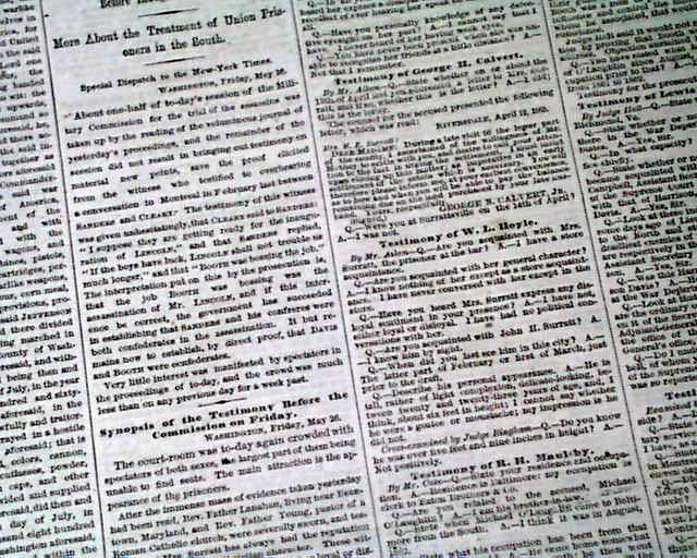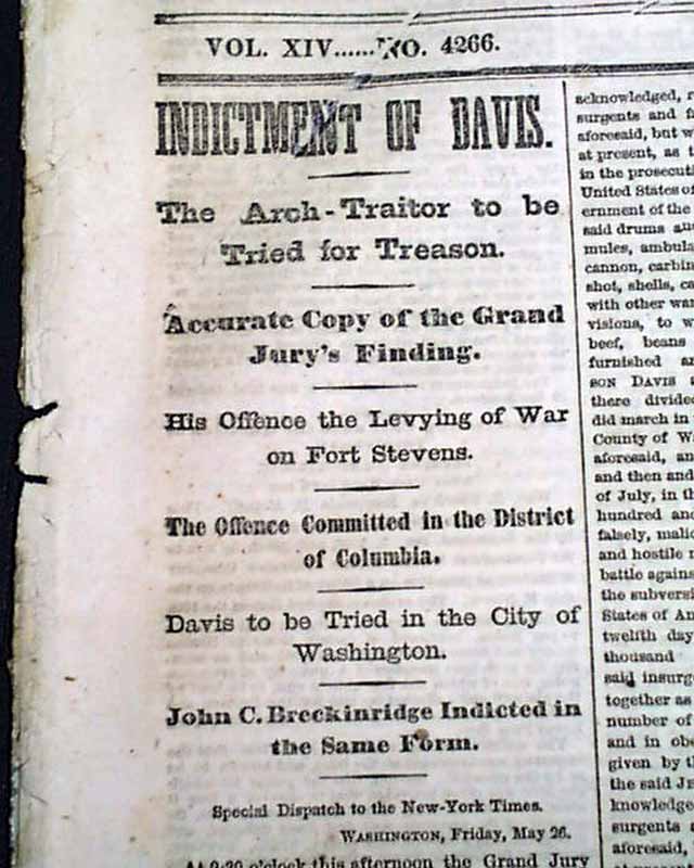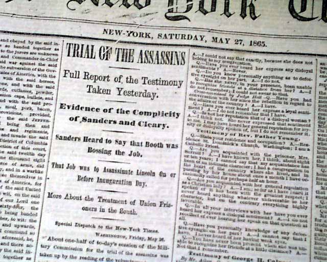 NEW YORK TIMES, May 27, 1865 Among the front page column heads are: "INDICTMENT OF DAVIS" "The Arch-Traitor to be Tried for Treason" "His Offence the Levying of War on Fort Stevens" "Davis to be Tried in the City of Washington" and: "TRIAL OF THE ASSASSINS" "Sanders Heard to Say that Booth was Bossing the Job" "That Job was to Assassinate Lincoln On or Before Inauguration Day" "More About the Treatment of Union Prisoners in the South" and more.