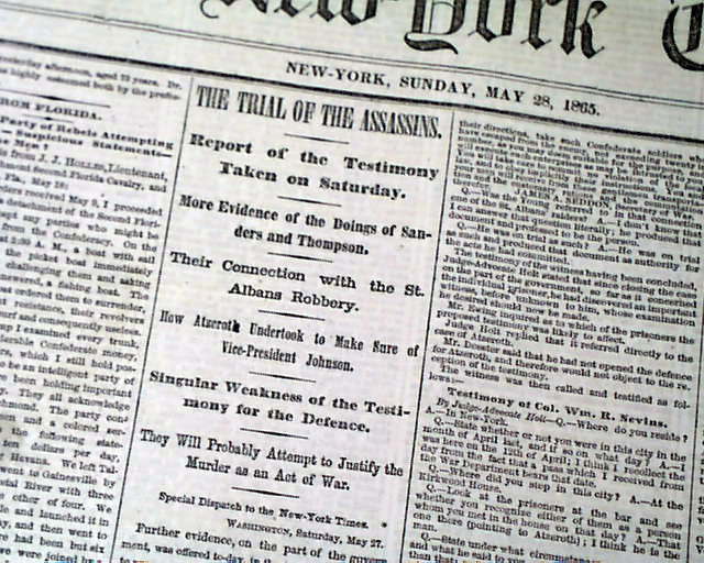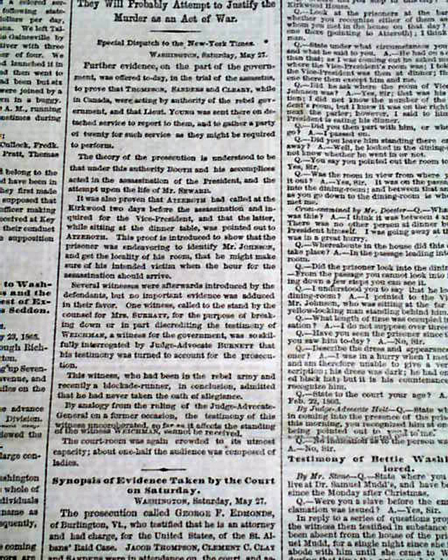 Also reports on: "The Trial Of the Assassins" "More Evidence of the Doings of Sanders & Thompson" "How Atzerotz Undertook to Make Sure of Vice-President Johnson" "They Will Probably Attempt to Justify the Murder as an Act of War" and more.