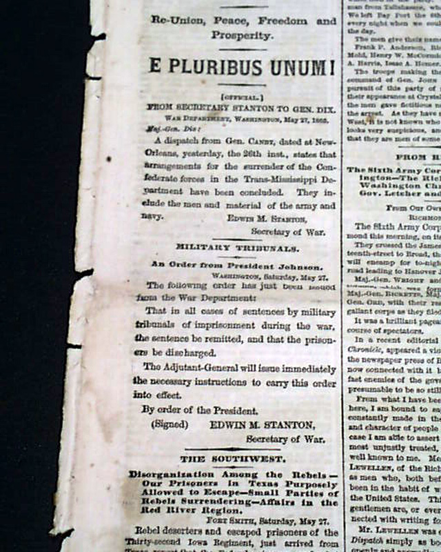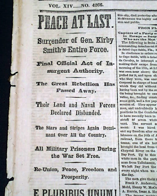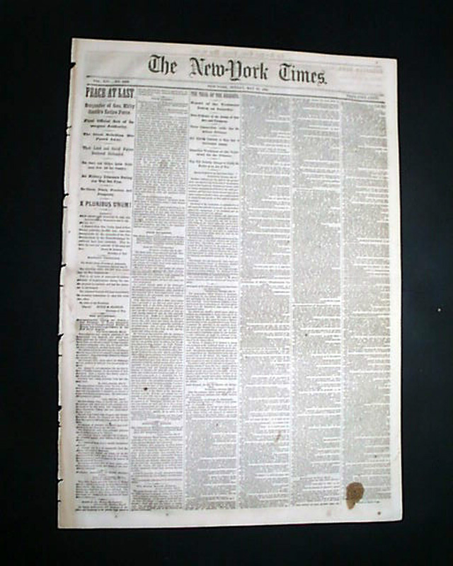 NEW YORK TIMES, May 28, 1865 Among the front page column heads are: "PEACE AT LAST" "Surrender of Gen. Kirby Smith's entire force" "Final Official Act of Insurgent Authority" "The Great Rebellion Has Passed Away" "Their Land and Naval Forces Declared Disbanded" "The Stars & Stripes Again Dominant Over All the County" "All Military Prisoners During the War Set Free" "E PLURIBUS UNUM!"