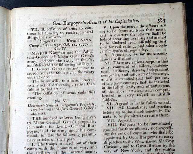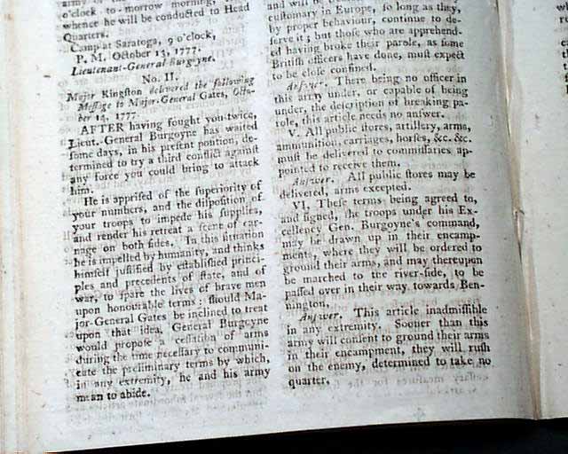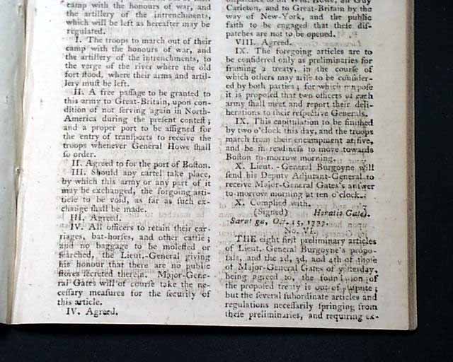 This is then followed by: "Gen. Burgoyne's Account of His Capitulation" which continues for six pages giving remarkable detail of the proceedings & correspondences, several signed in type by each: Horatio Gates and Lieutenant General Burgoyne.