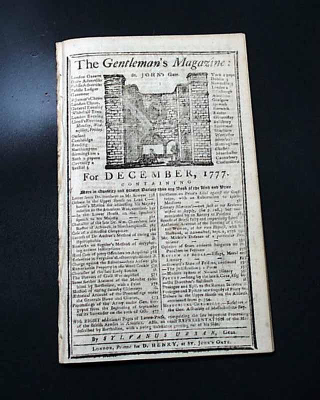 Item # 702480 GENTLEMAN'S MAGAZINE, London, December, 1777 The very first article is a two page continued: "Debate in the House of Lords on Lord Chatham's Motion for an Address to his Majesty relative to the American War".
