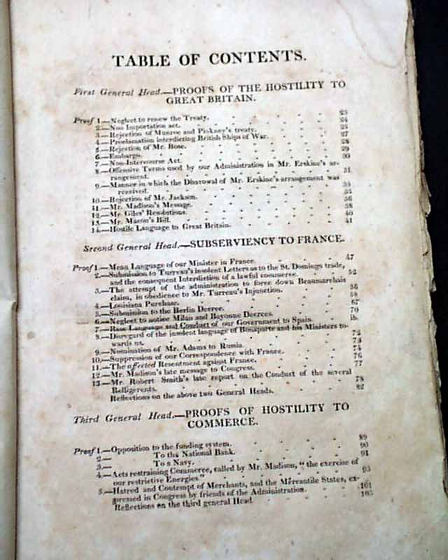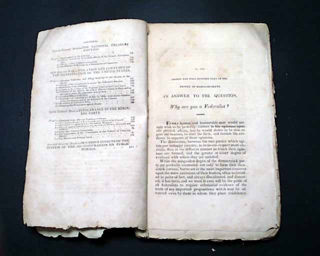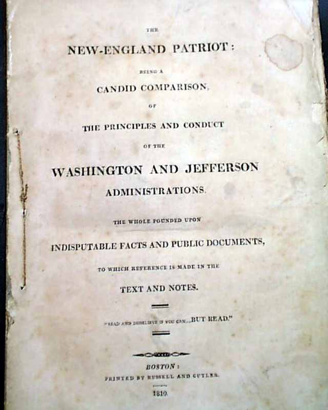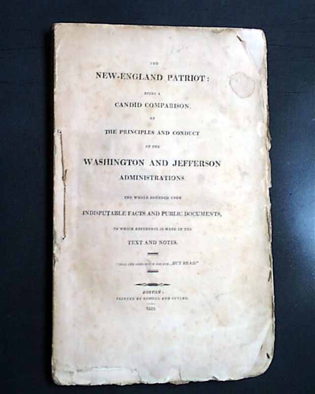 A pamphlet, with the full title page noting; "The NEW-ENGLAND PATRIOT: Being A Candid Comparison of the Principles and Conduct of the WASHINGTON and JEFFERSON Administrations. The Whole Founded Upon Indisputable Facts & Public Documents, to which reference is made in the Text And Notes": with the imprint noting: "Boston: Printed by Russell and Cutler, 1810".
