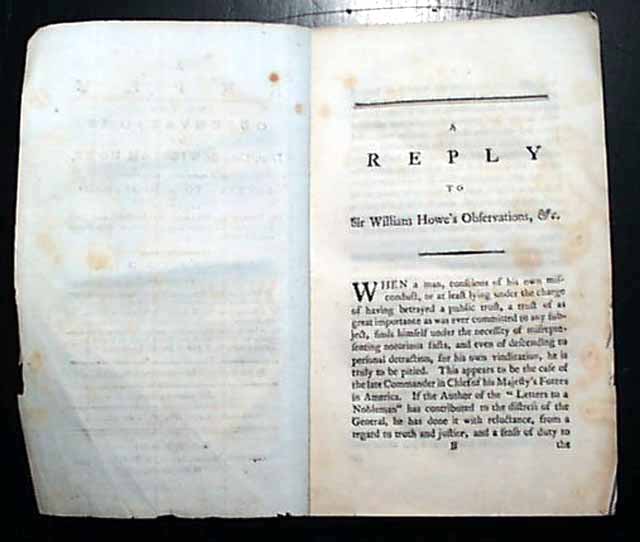 Lengthy pamphlet: "A REPLY to the OBSERVATIONS of LIEUT. GEN. SIR WILLIAM HOWE, on a pamphlet, entitled Letters To A Nobleman: in which His Misrepresentations are detected, and those Letters are supported, by a Variety of New matter and Argument..." with more (see photos).
