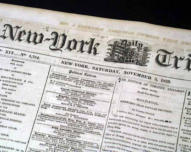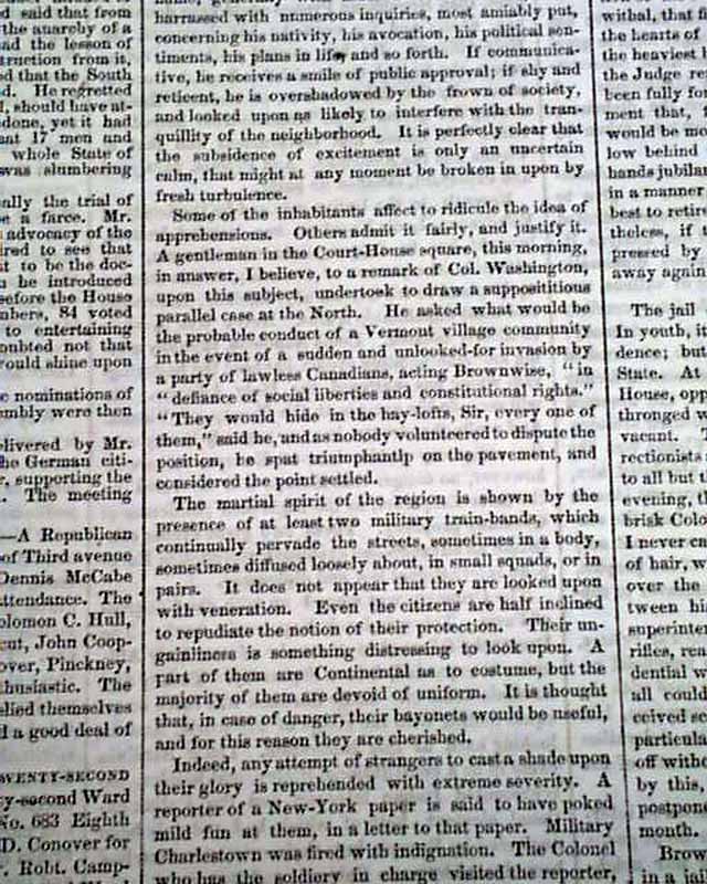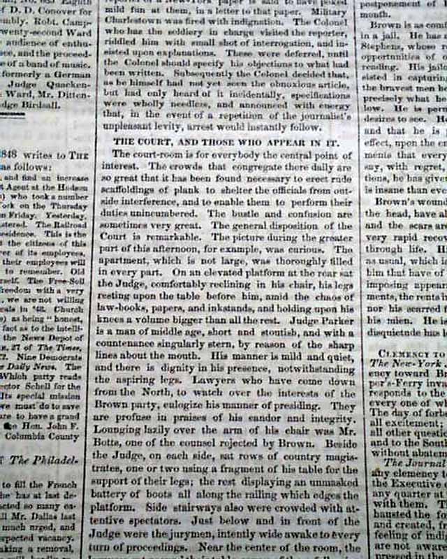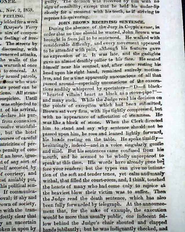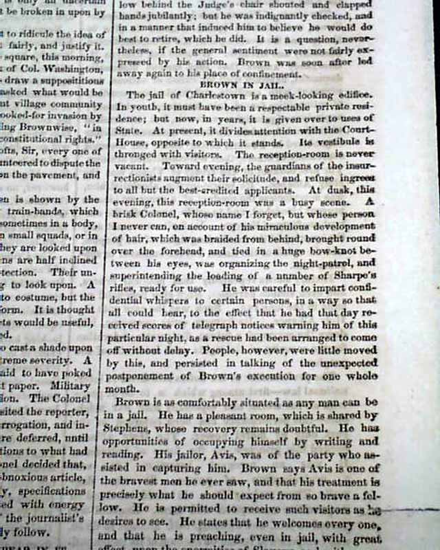 Page 5 has 2 columns taken up with: "The Invasion of Virginia" "Public Feelings--Sentence of Brown--State of the Prisoner" with subheads including: "The Court, and Those Who Appear In It" "John Brown Receiving Sentence" "Brown In Jail" "Clemency to the Harper's Ferry Prisoners". Very extensive reporting.