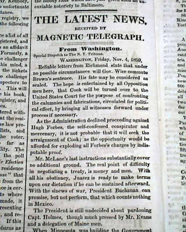 NEW YORK TRIBUNE, Nov. 5, 1859 Page 4 has a report from Washington: "Reliable letters from Richmond state that under no possible circumstances will Gov. Wise commute Brown's sentence. His fate may be considered as sealed..." with a bit more.