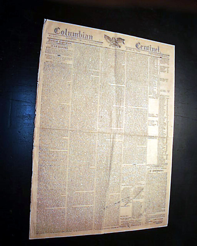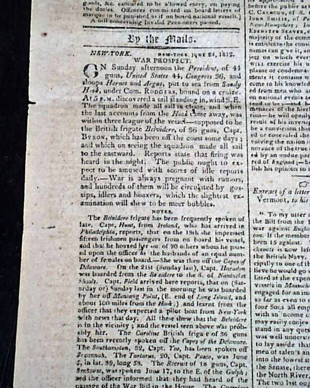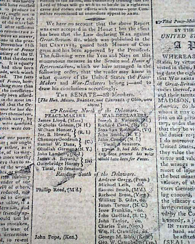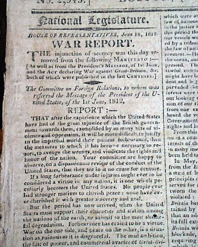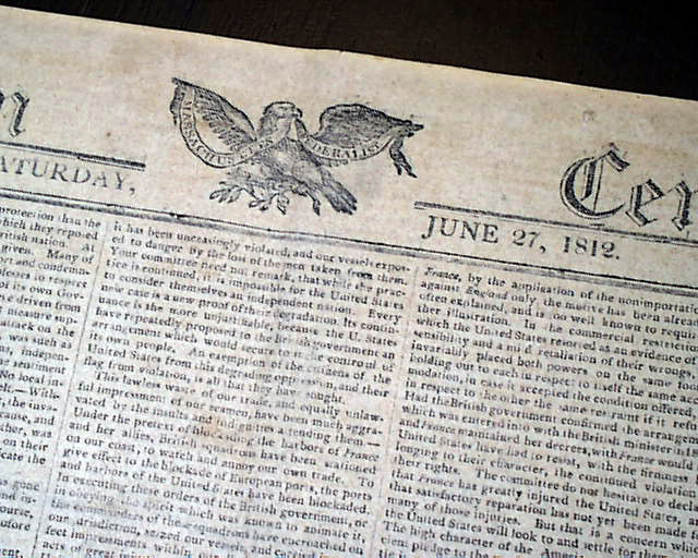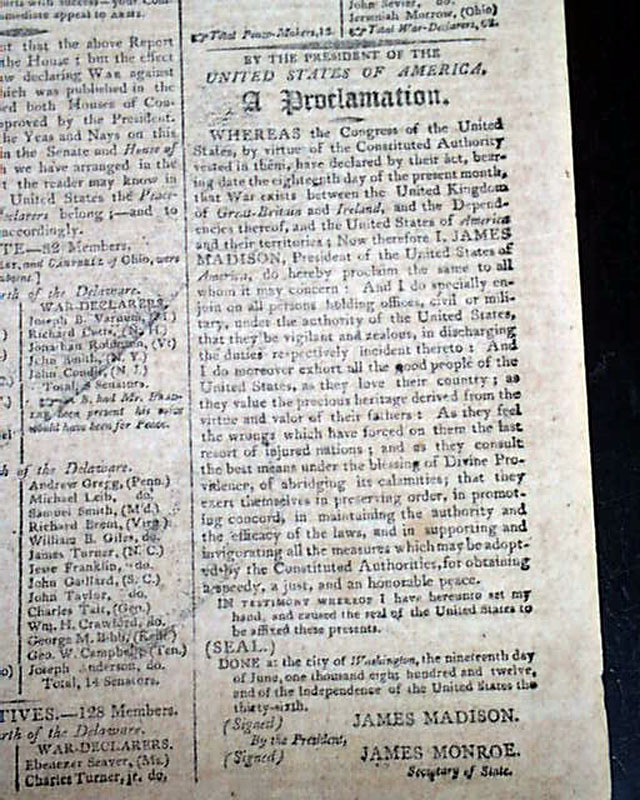 COLUMBIAN CENTINEL, Boston, June 27, 1812 In the last column of the front page is the very historic: "Proclamation" "By The President of the United States of America" & signed by James Madison, declaring that a state of war exists between the United States & England, marking the official beginning of the War of 1812.