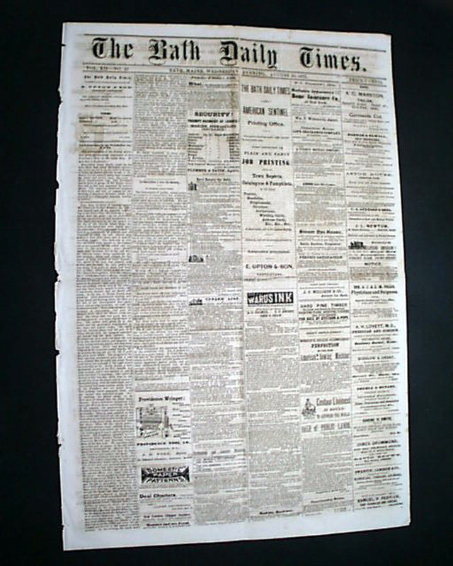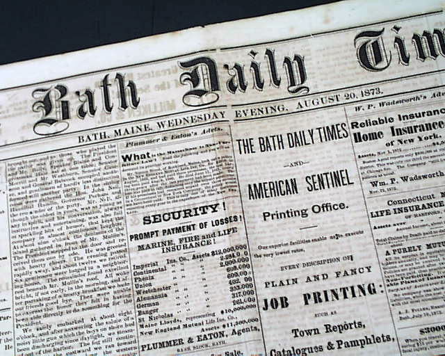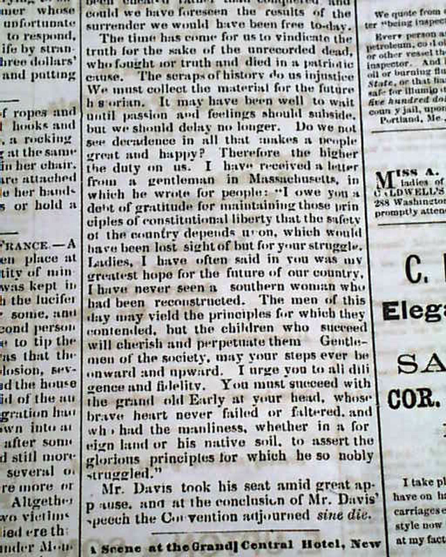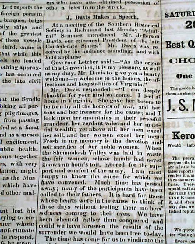 THE BATH DAILY TIMES, Maine, Aug. 20, 1873  Page 2 has an article: "J. Davis Makes a Speech". Speeches by Jefferson Davis after the Civil War are very uncommon. In this speech at the Southern Historical Society, he reflects upon events of the Civil War.