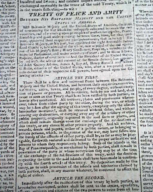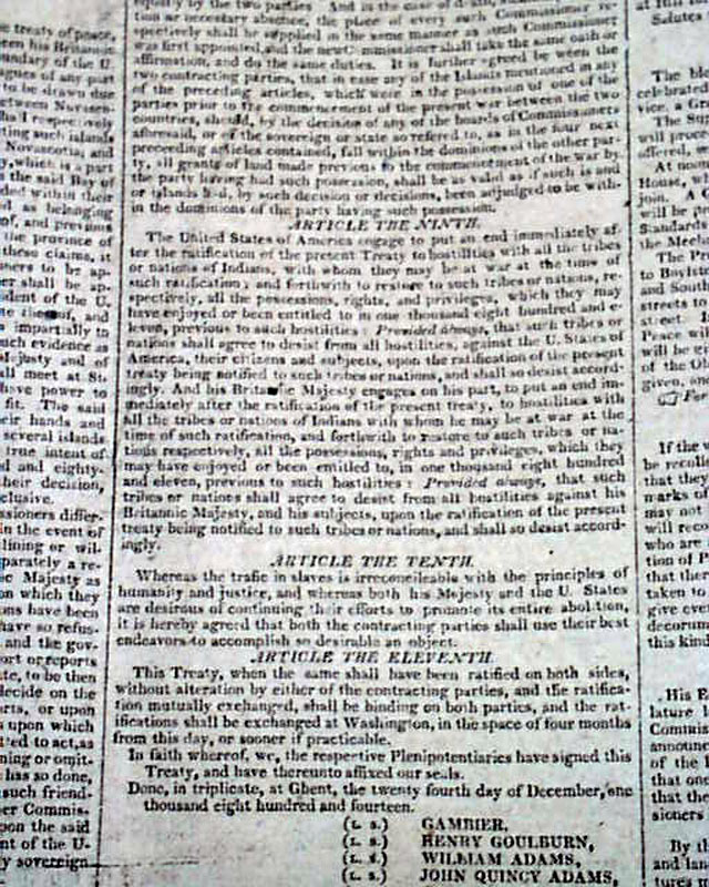 Hereafter is the text of the "Treaty Of Peace and Amity" containing eleven articles, signed in type: John Quincy Adams, J. A. Bayard, H. Clay, Albert Gallatin, plus several other French and American officials.