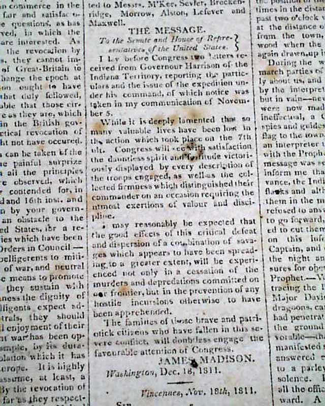 This fine report is prefaced with a "Message" from President Madison, introducing the: "Battle With the Indians".