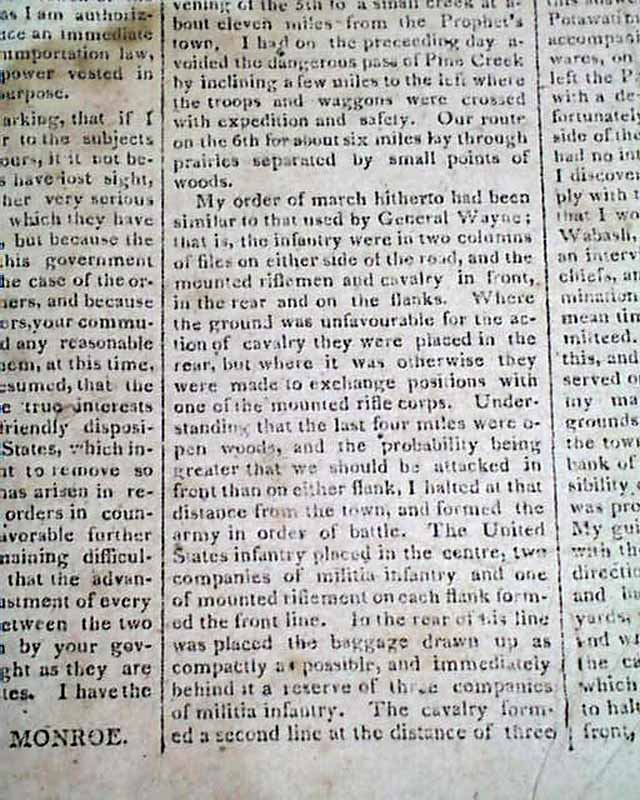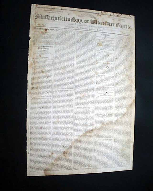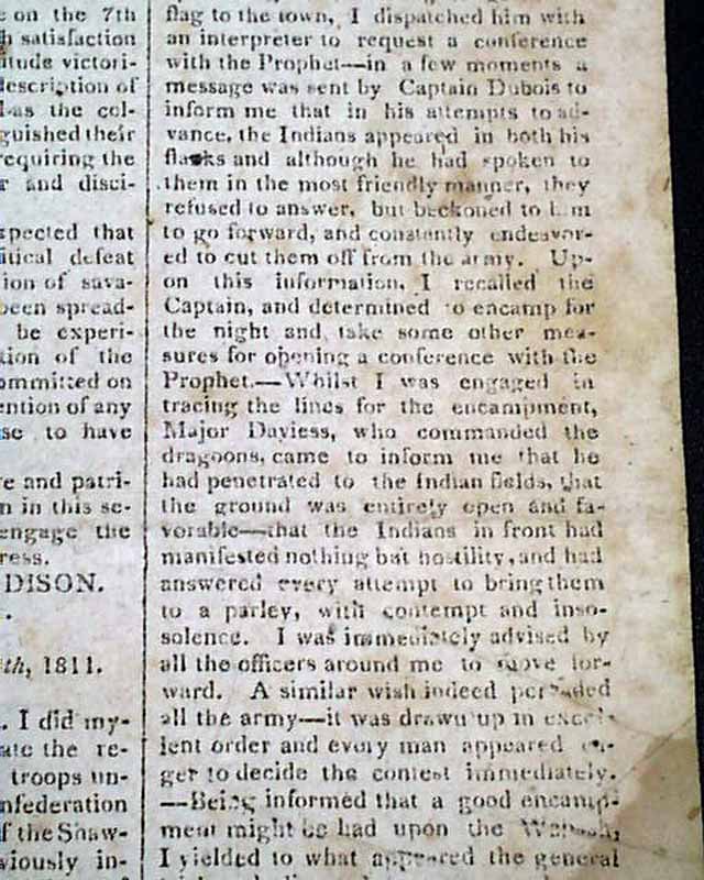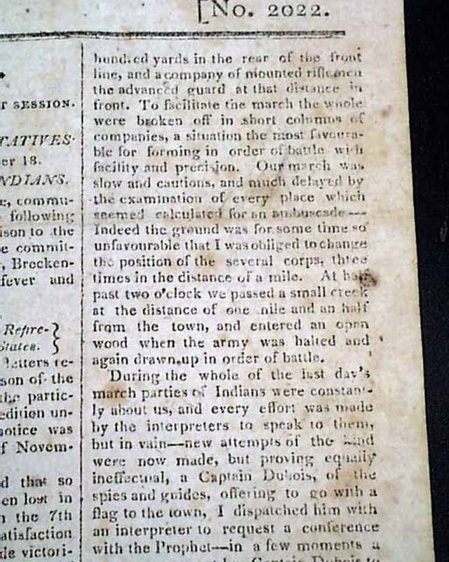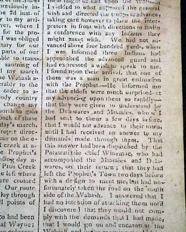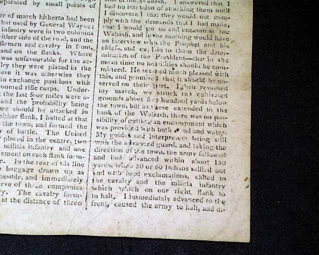 MASSACHUSETTS SPY, OR WORCESTER GAZETTE, JAN. 8, 1812 This issue contains one of the most detailed, lengthy account of the battle of Tippecanoe we have seen in a newspaper, taking 1 1/2 columns on the front page and almost the entirety of page 2.