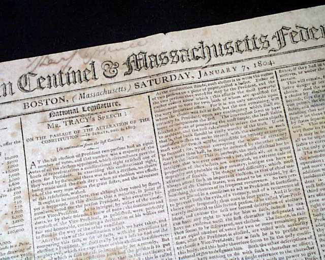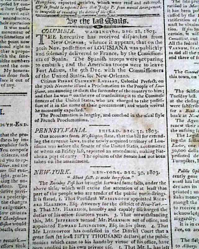 COLUMBIAN CENTINEL & MASSACHUSETTS FEDERALIST, Boston, Jan. 7, 1804 To acknowledge a formal consummation of the Louisiana Purchase Treaty, page 2 has a report from Washington that: "... received dispatches from New Orleans, whence it appears that on the 30th Nov. possession of LOUISIANA was publicly and solemnly delivered to France by the commissioners of Spain..".
