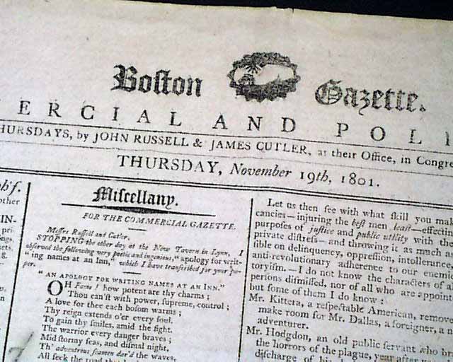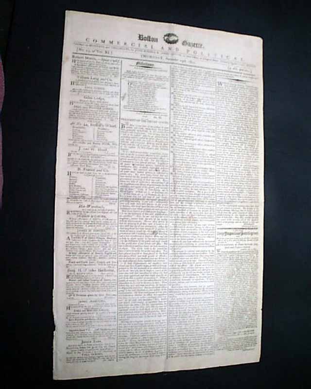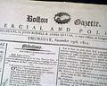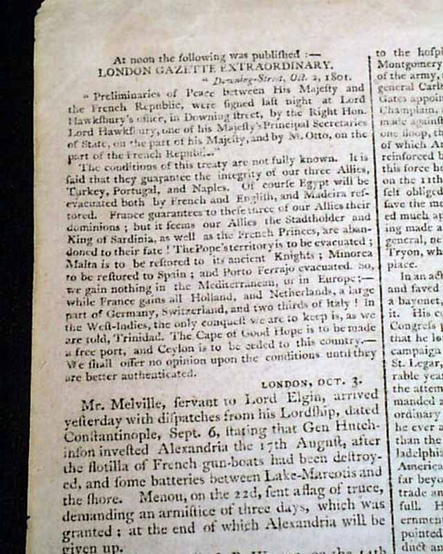 BOSTON GAZETTE, Nov. 19, 1801 Page 2 begins with a report from the London Gazette Extraordinary, announcing that the peace treaty known as the Treaty of Amiens had been signed, and from the city where it happened: London.