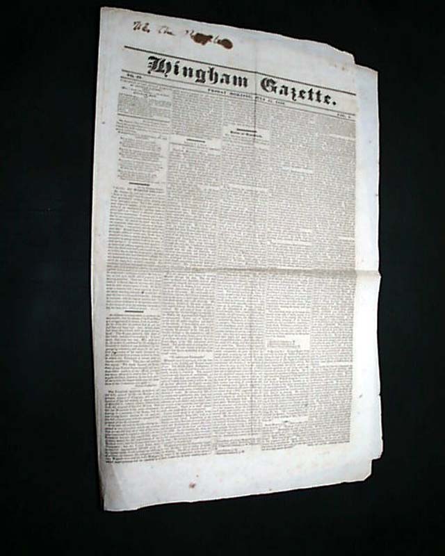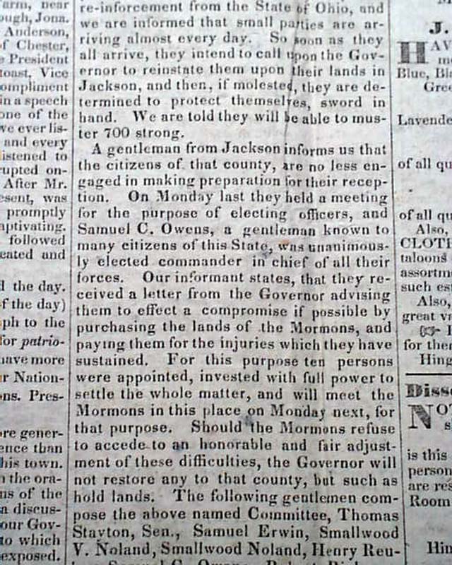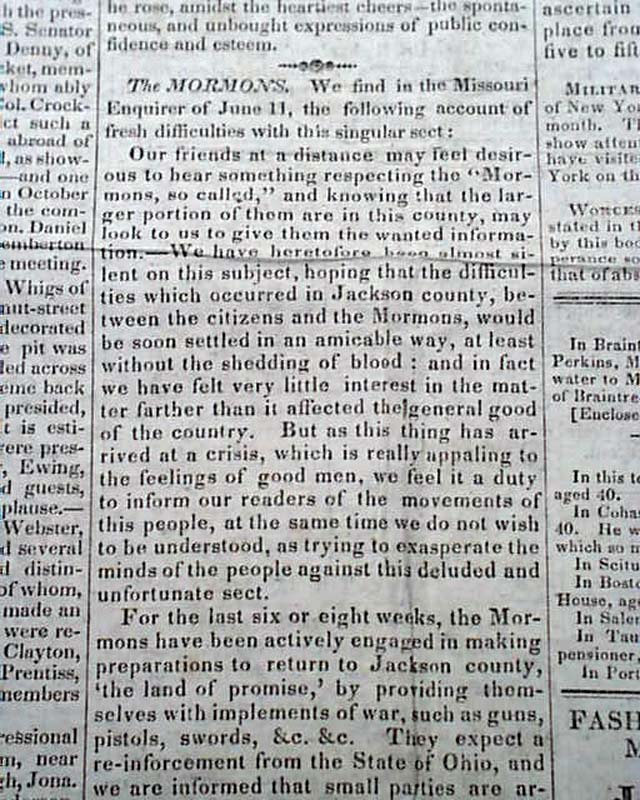 HINGHAM GAZETTE, Massachusetts, July 11, 1834 Page 3 has a report headed: "The Mormons" with a bit of an introduction noting: "...the following account of fresh difficulties with this singular sect" and what follows is a lengthy letter from Missouri.