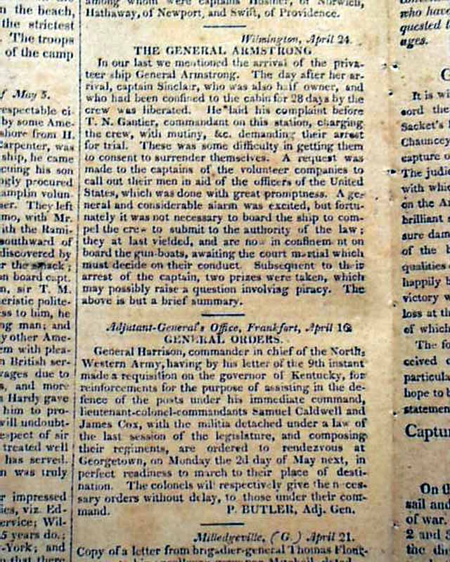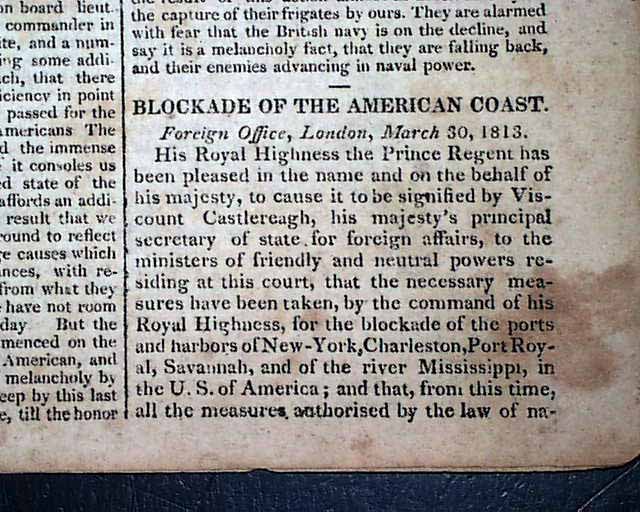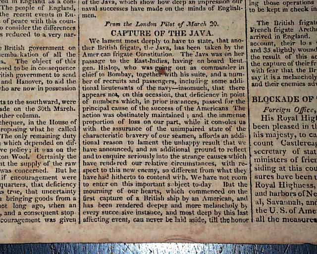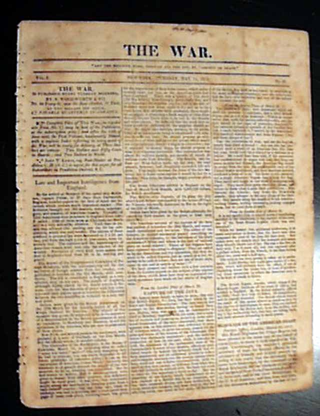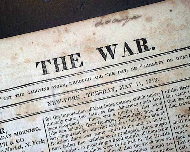 THE WAR, New York, May 11, 1813 One-third of the front page is taken up with: "Capture of the Java" by the frigate Constitution. Also on the front page: "Late & Important Intelligence from England" and "Blockade of the American Coast".
