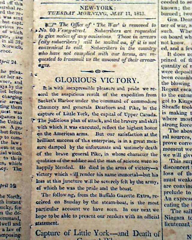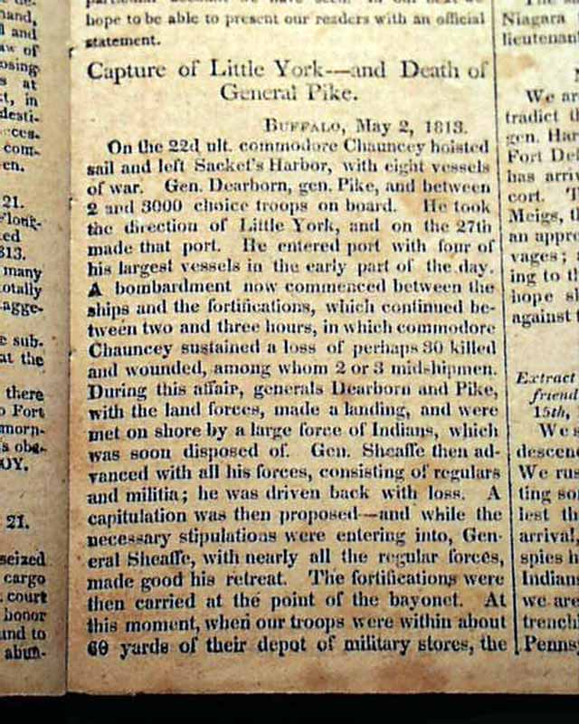 Inside includes: "Capture of Little York--and Death of General Pike", which is present-day Toronto. "Glorious Victory" is a nice editorial concerning the capture of York. Elsewhere: "The Attack on Havre-de-Grace" "British Depredations" "North-Western Army" "Latest from Fort Meigs" "The Squadron" "Summary" and more.