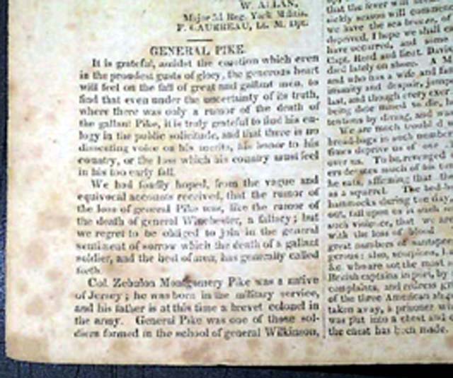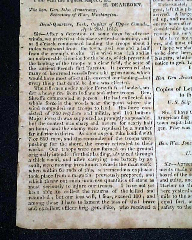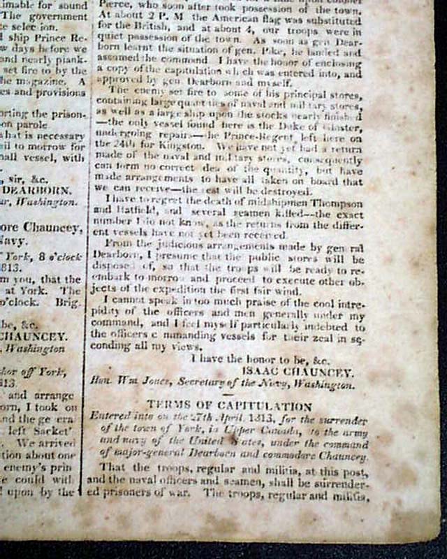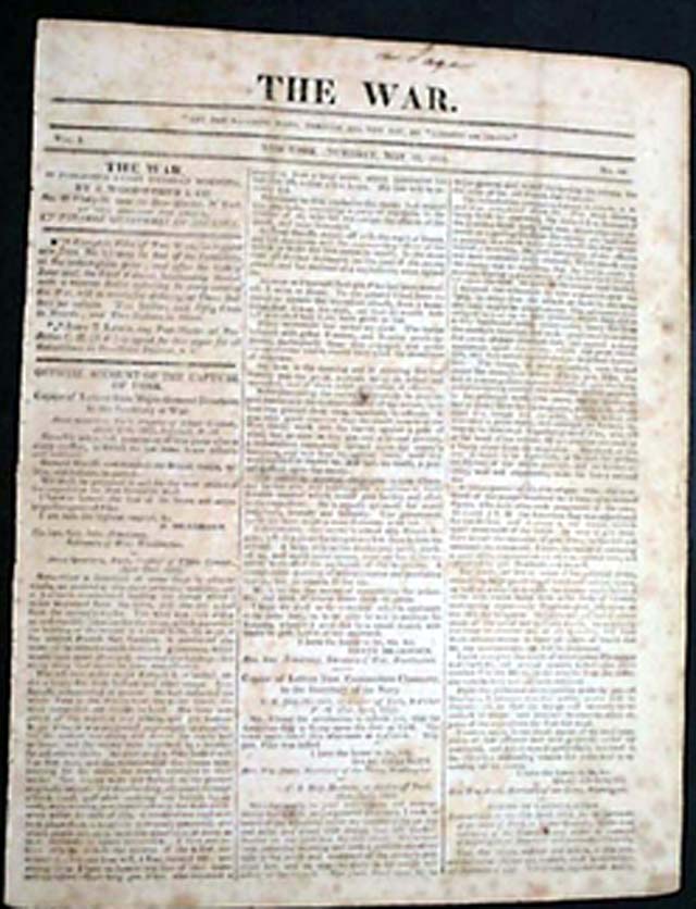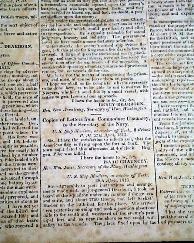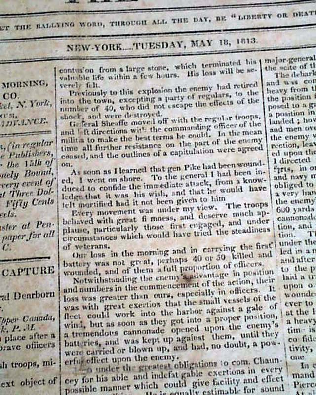 THE WAR, New York, May 18, 1813 The entire front page, and part of page 2, are taken up with documents headed: "Official Account of The Capture of York" which includes a prefacing document signed: H. Dearborn, plus a more detailed letter from York, signed: Henry Dearborn, and a lengthy letter from the U.S. ship Madison at York, signed: Isaac Chauncey, followed by the: "Terms of Capitulation" which carry over to page 2. This is followed by: "General Pike" which deals with his death.