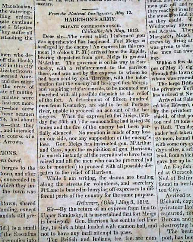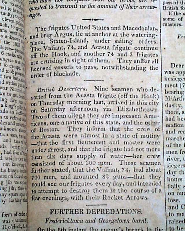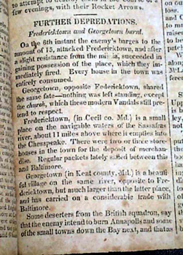 Elsewhere in the issue are: "American Prisoners in Jamaica' "British Deserters" "Further Depredations--Fredericktown & Georgetown Burnt" "Harrison's Army" "Escape from a British Prison" and even more.