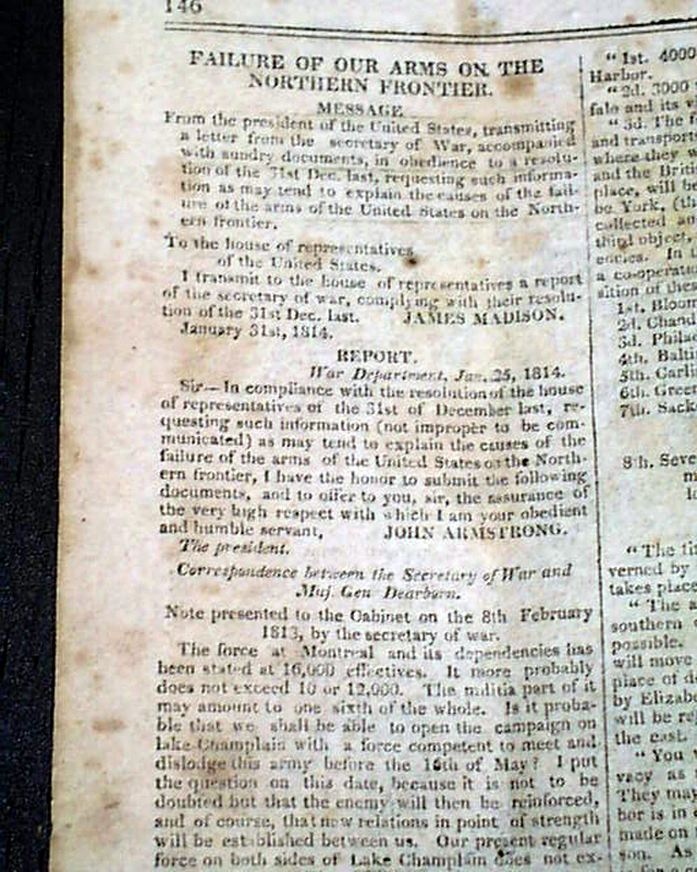 Notable content inside includes: "Failure of Our Arms on the Northern Frontier" which is prefaced with a "Message" signed in type: James Madison and which includes documents signed by H. Dearborn and John Armstrong. Also within: "Fortunate Escape" "Desperate Action" which is a report of a naval encounter datelined Wilmington, North Carolina