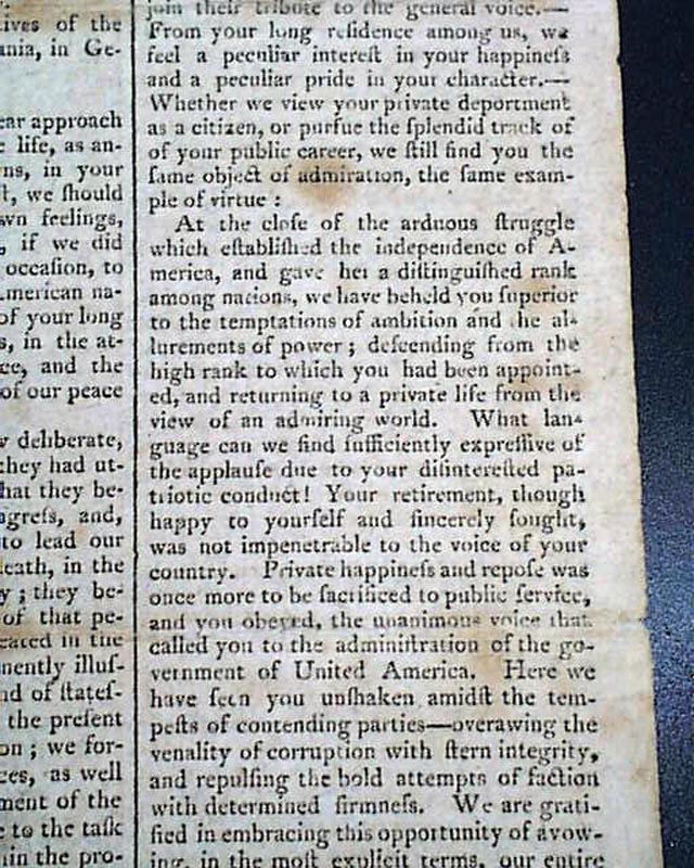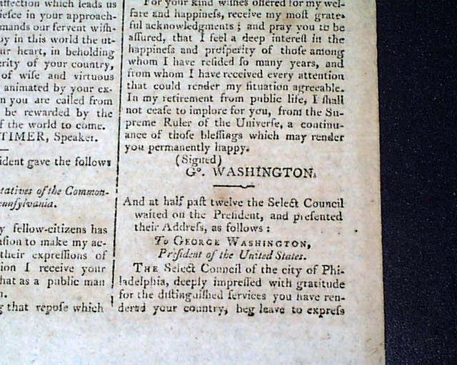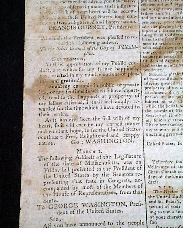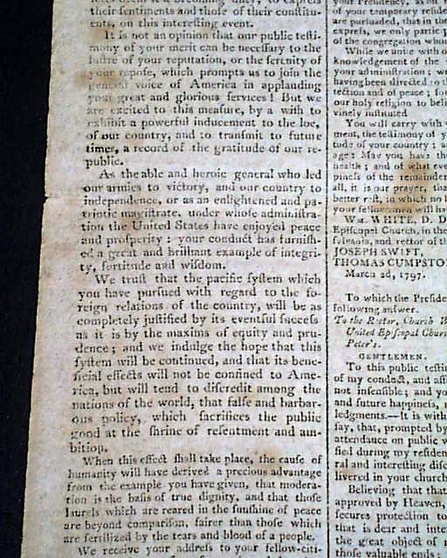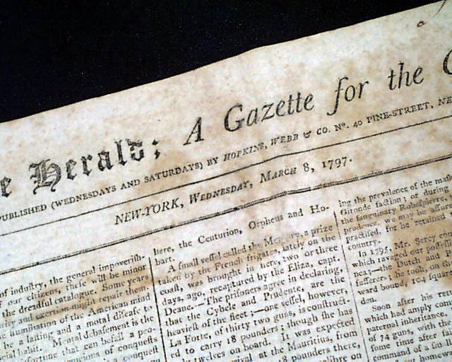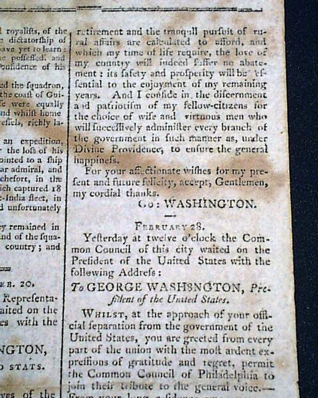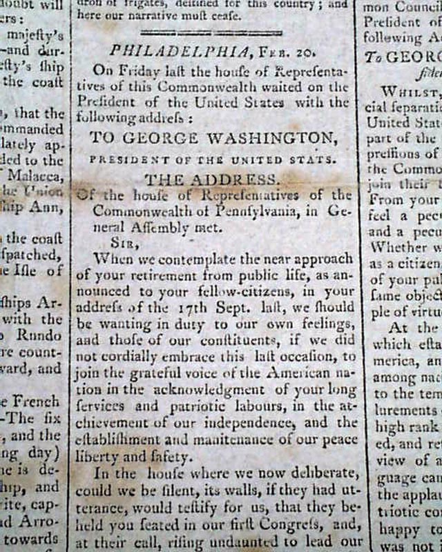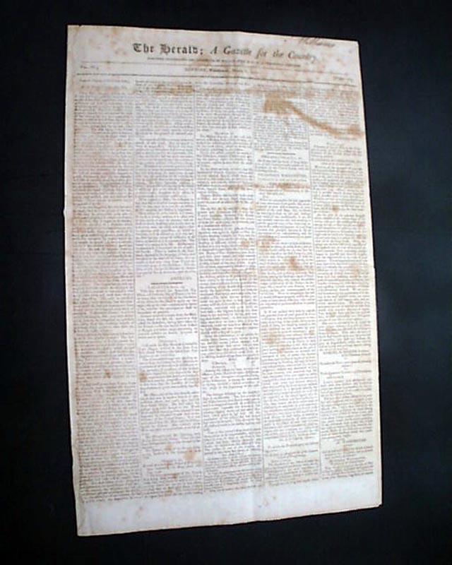 THE HERALD; A GAZETTE FOR THE COUNTRY, New York, March 8, 1797 The front page has an address: "To George Washington" from the Penna. legislature on his retirement from public office, to which he responded with a letter signed in type; Go. Washington.