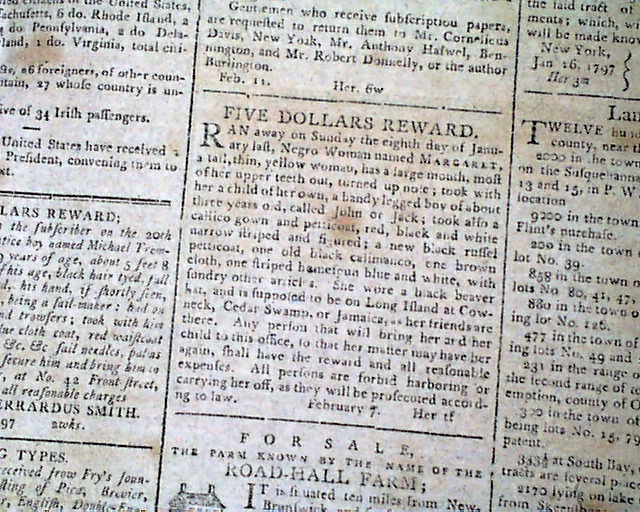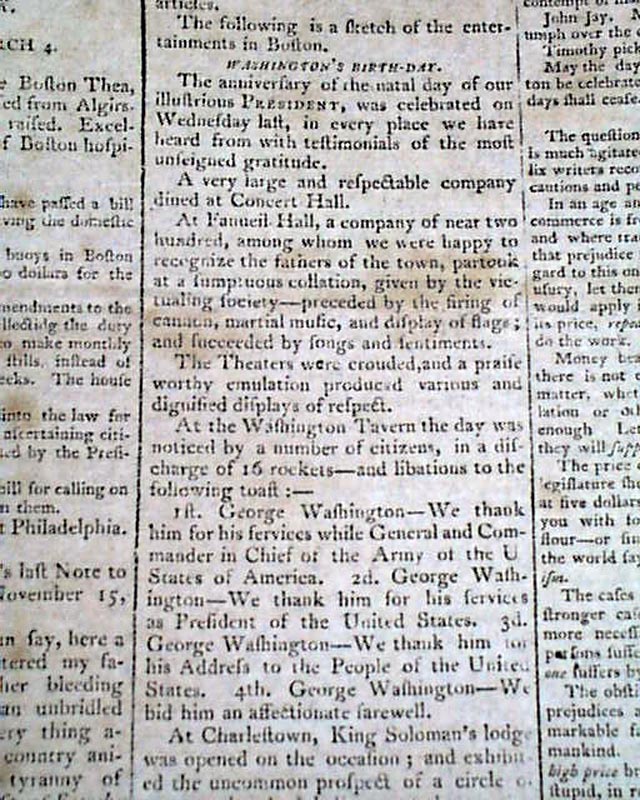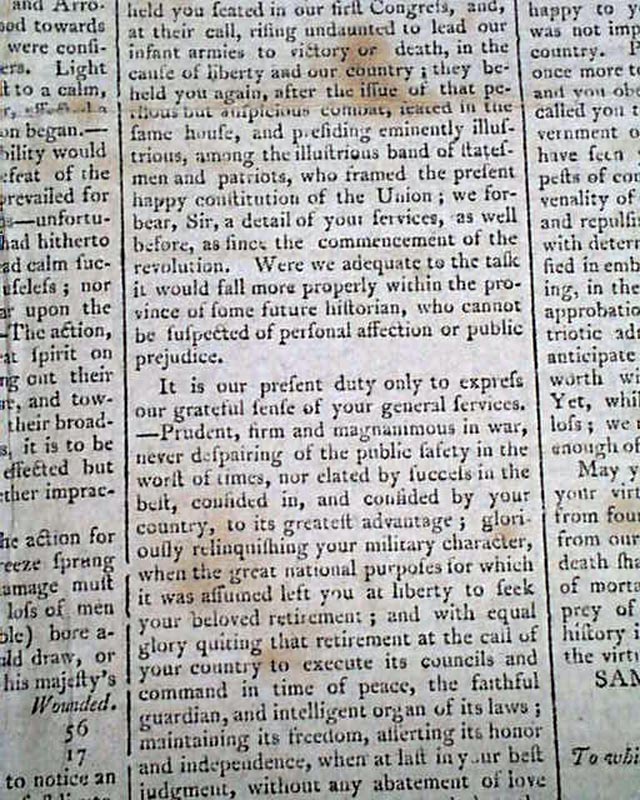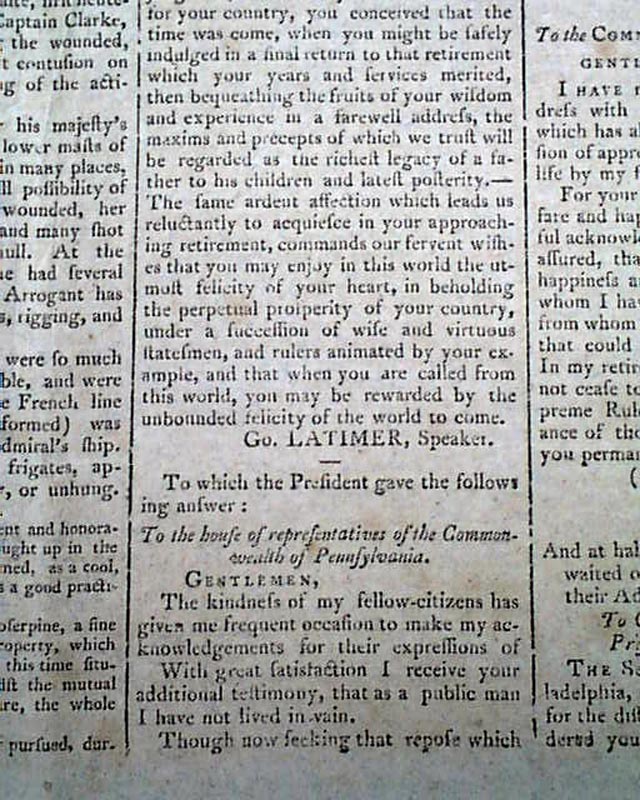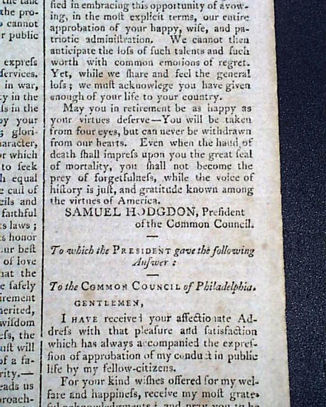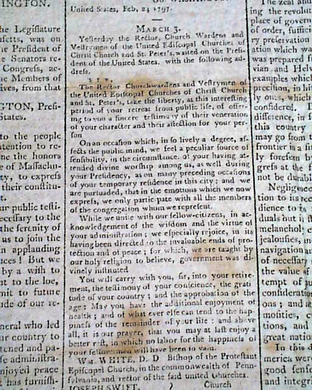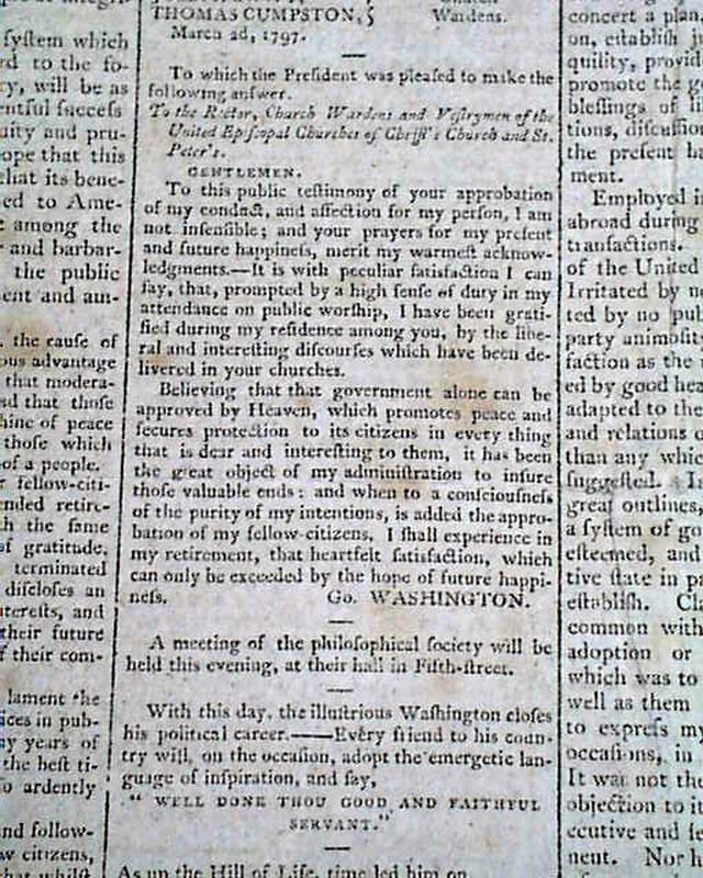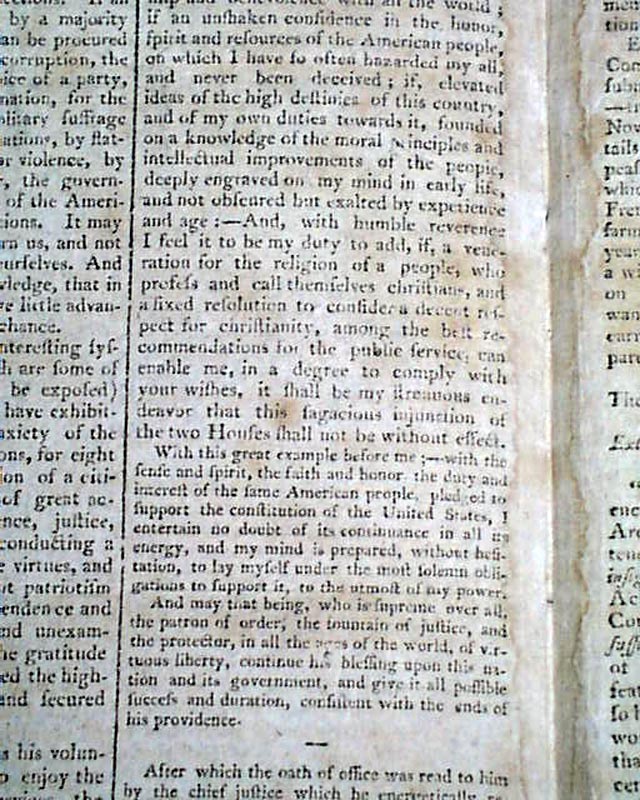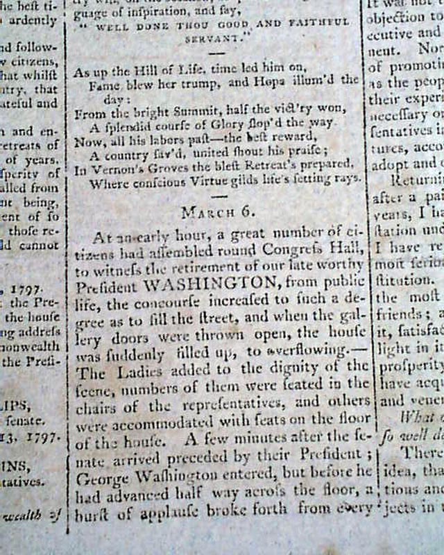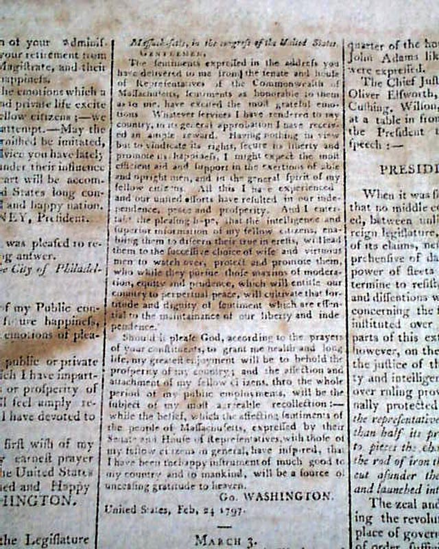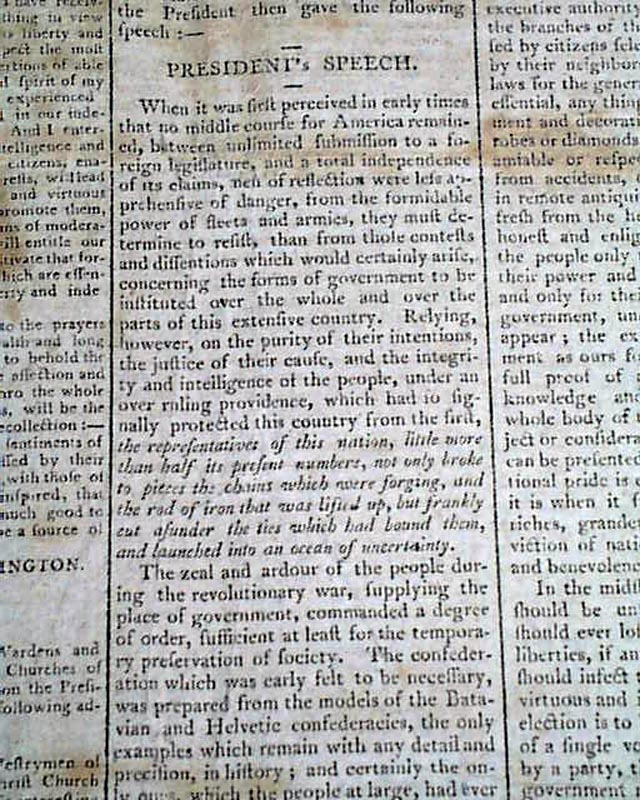 Then a terrific report on the ceremony immediately preceding the "President's Speech", being the lengthy inaugural address of John Adams. The preface mentions in part: "...after the senate arrived preceded by their President; George Washington entered but before he had advanced half way across the floor a burst of applause broke forth from every quarter...on the entrance of John Adams like marks of approbation were expressed..." with more.
