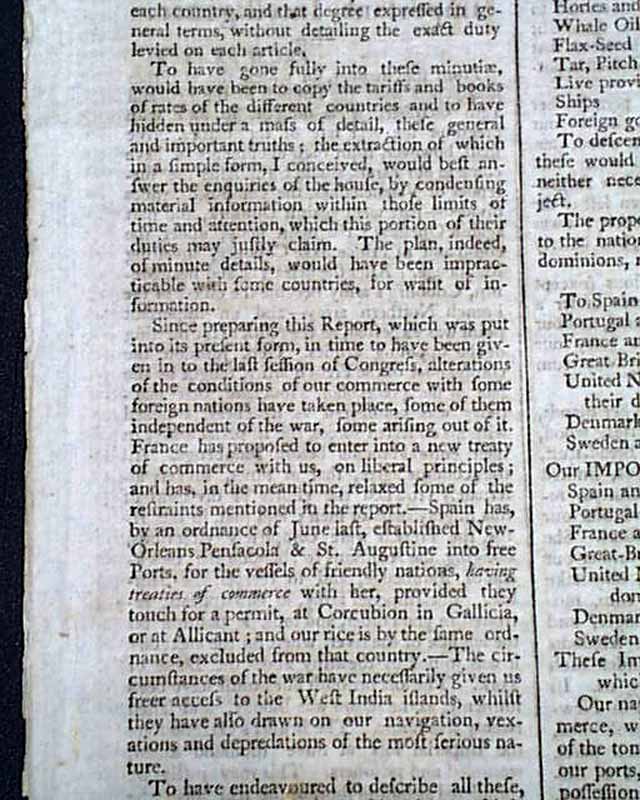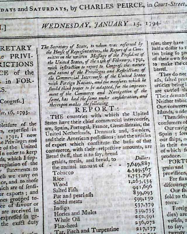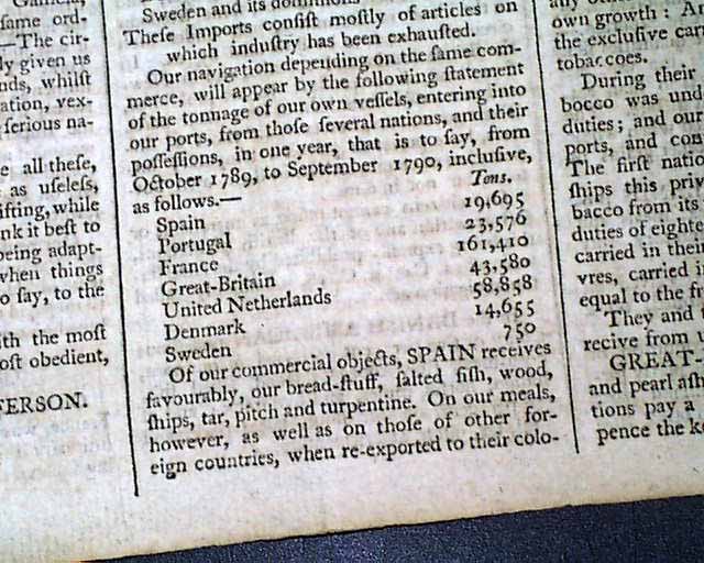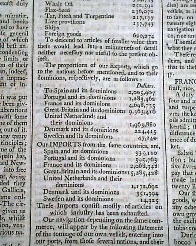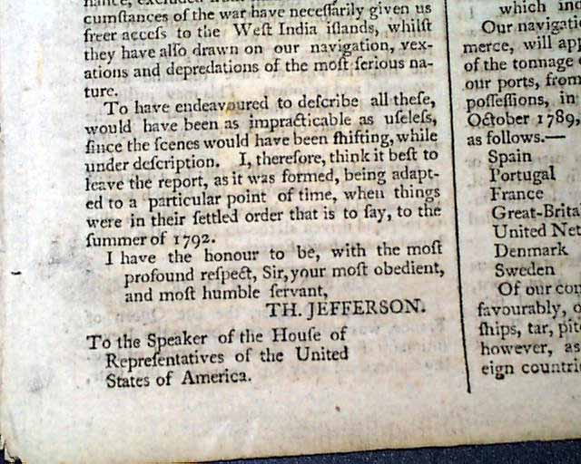 All of the front page and most of page 2 are taken up with the: "Report Of the Secretary of State on the Privileges and Restrictions on the Commerce of the United States in Foreign Countries" which is signed in type: Th. Jefferson. Following the letter are considerable details.