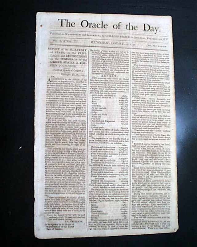THE ORACLE OF THE DAY, Portsmouth, New Hampshire, Jan. 15, 1794 This is a quite scarce 18th century American title, this being the volume 2, number 13 issue. It existed only until 1799.
