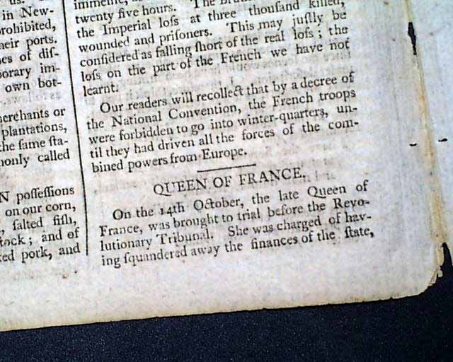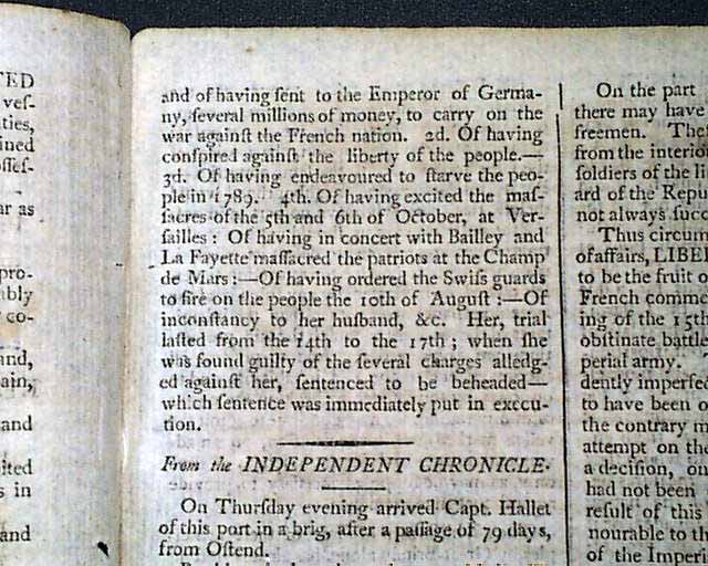 Inside has a report headed: "Queen Of France' which notes in part: "On the 14th October, the late Queen of France was brought to trial before the Revolutionary Tribunal. She was charged of having squandered away the finances of the state..." with additional charges. Then the report closes with: "...when she was found guilty of the several charges alleged against her, sentenced to be beheaded--which sentence was immediately put in execution."