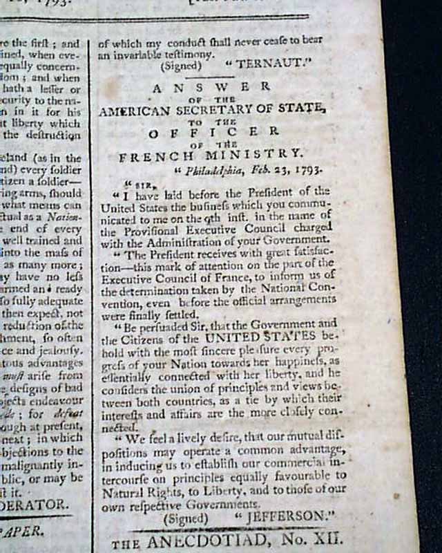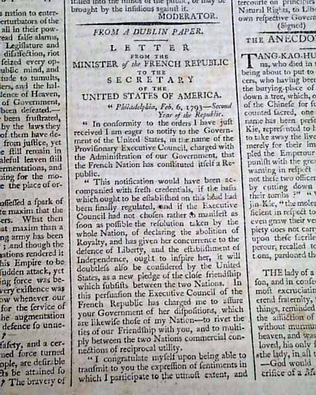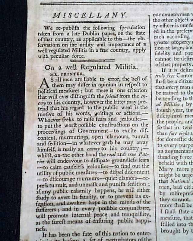Half of the front page is taken up with a lengthy report headed: "On A Well Regulated Militia". Following this is a: "Letter From the Minister of the French Republic to the Secretary of the United States of America", in which they proudly announce: "...that the French Nation has constituted itself a Republic...". This is followed by the reply by the Secretary of