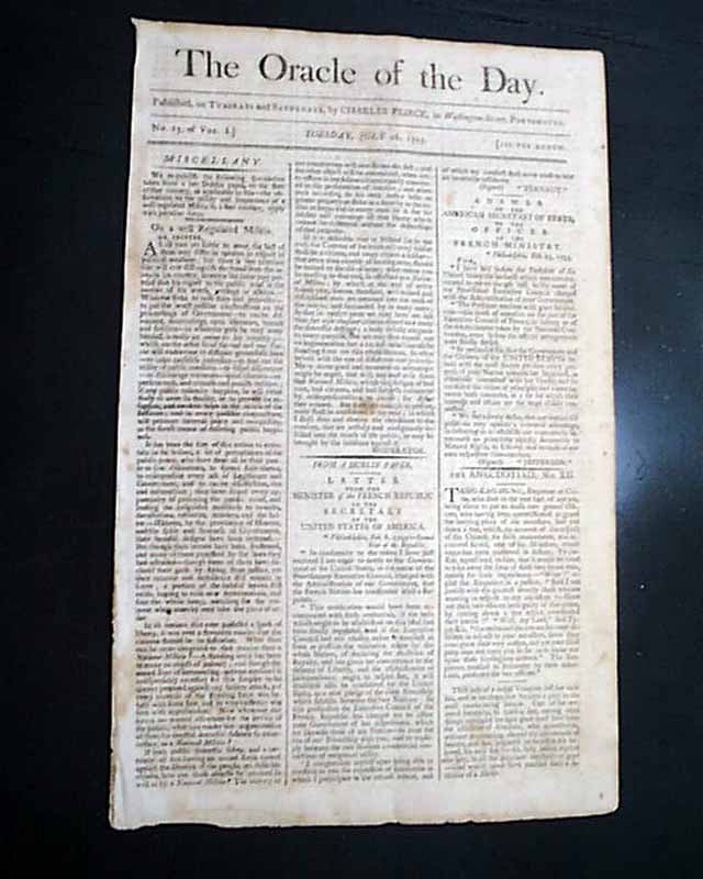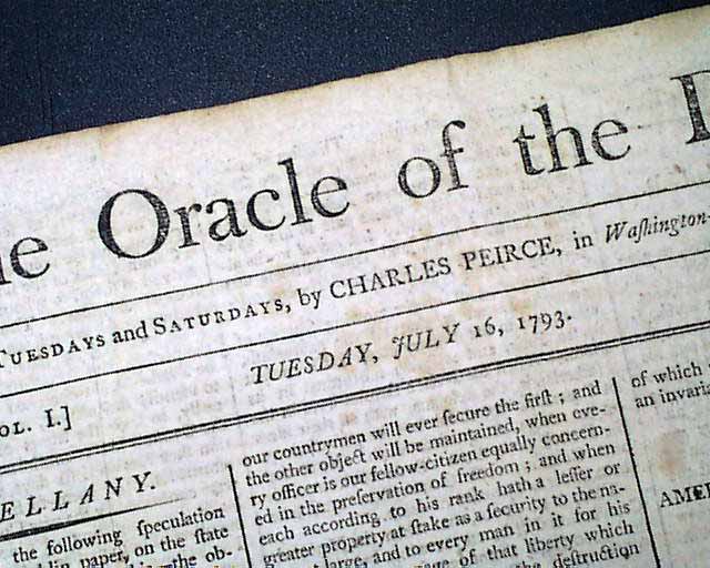 THE ORACLE OF THE DAY, Portsmouth, New Hampshire, July 16, 1793 This is a quite scarce 18th century American title, this being the volume 1, number 13 issue. It existed only until 1799.