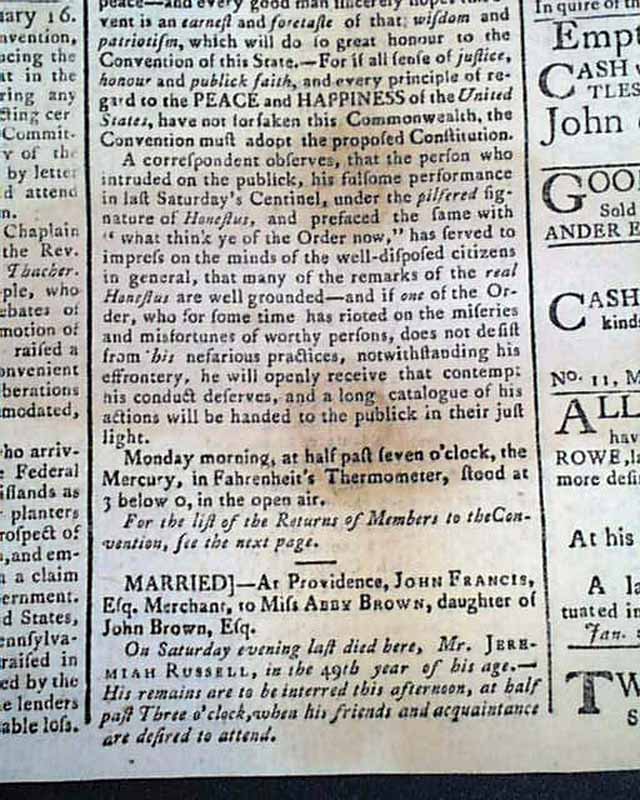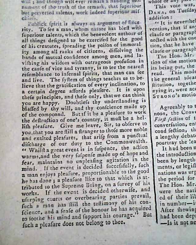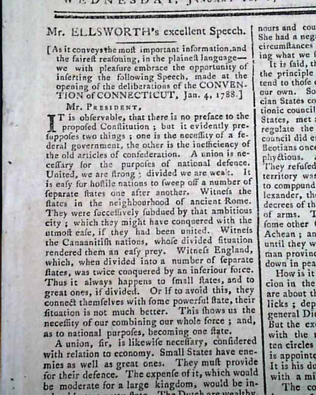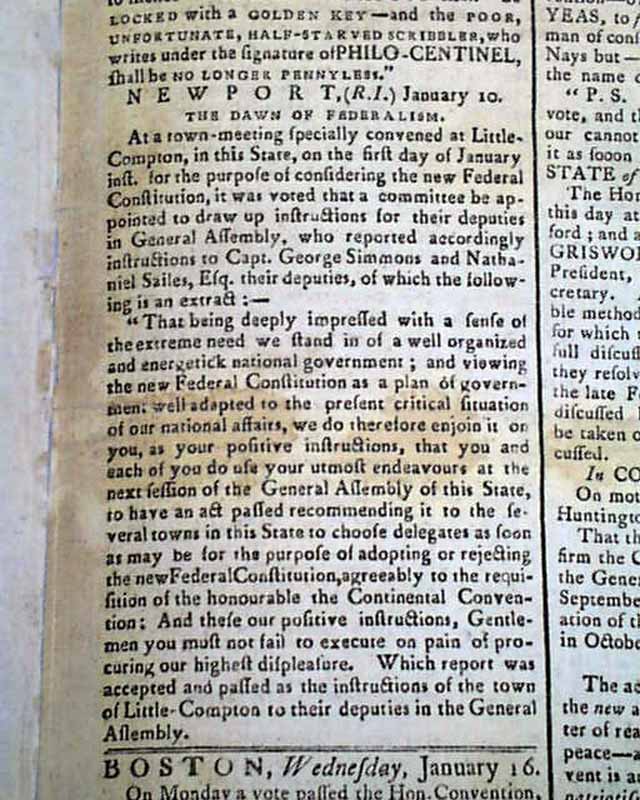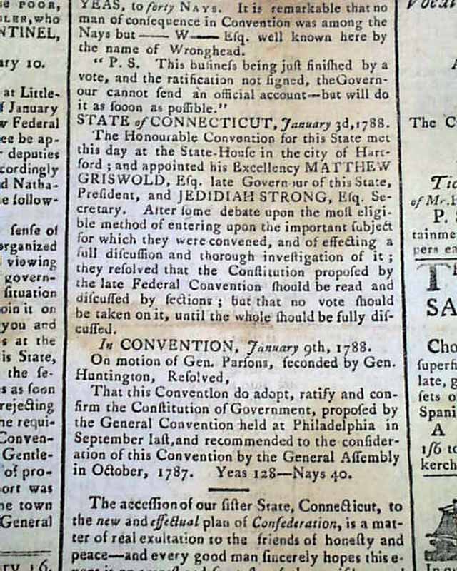 As we predicted in our last, so it happened--Monday morning was ushered in with the ringing of bells in this metropolis, on account of the pleasing intelligence received by Saturday night's mail, that the State of Connecticut had added a FOURH PILLAR to that GRAND REPUBLICAN SUPERSTRUCTURE, the FEDERAL CONSTITUTION..." followed by more concerning the Constitution discussions in the various states.