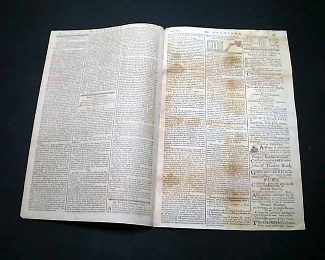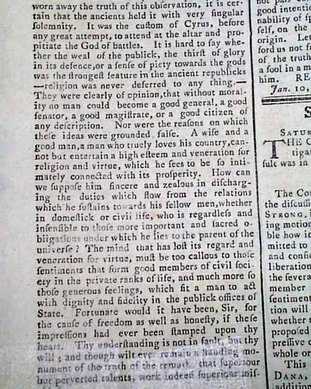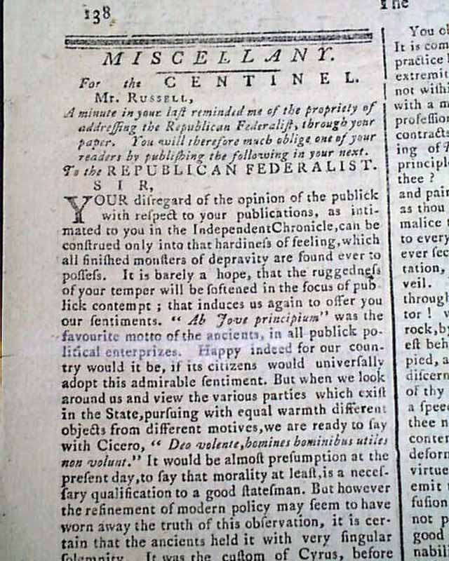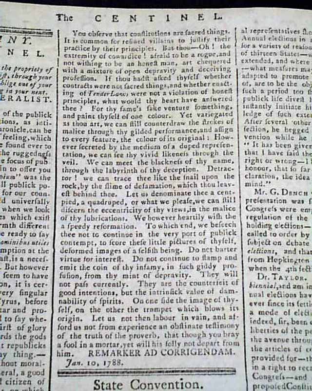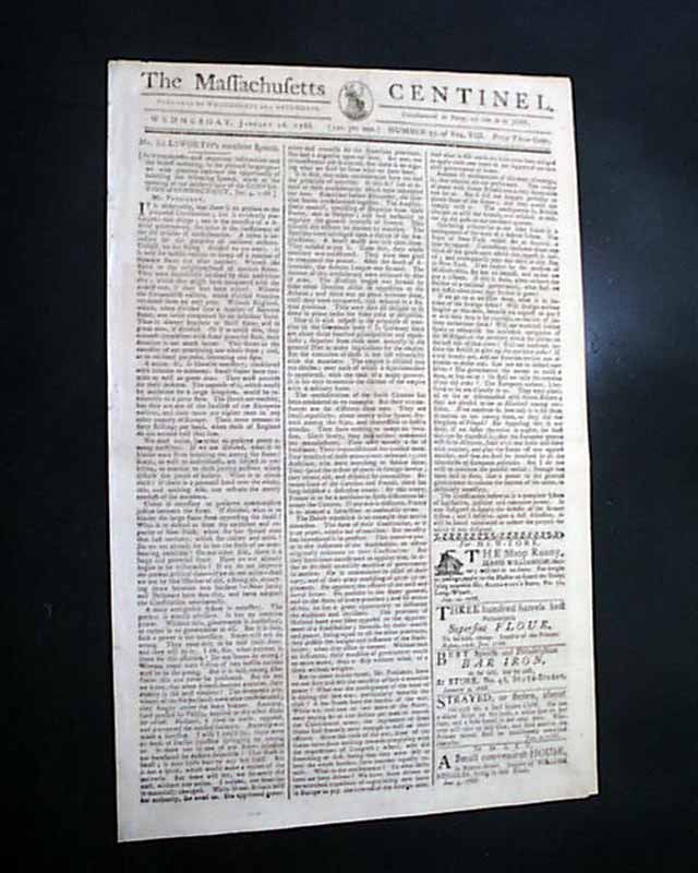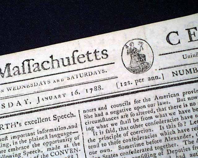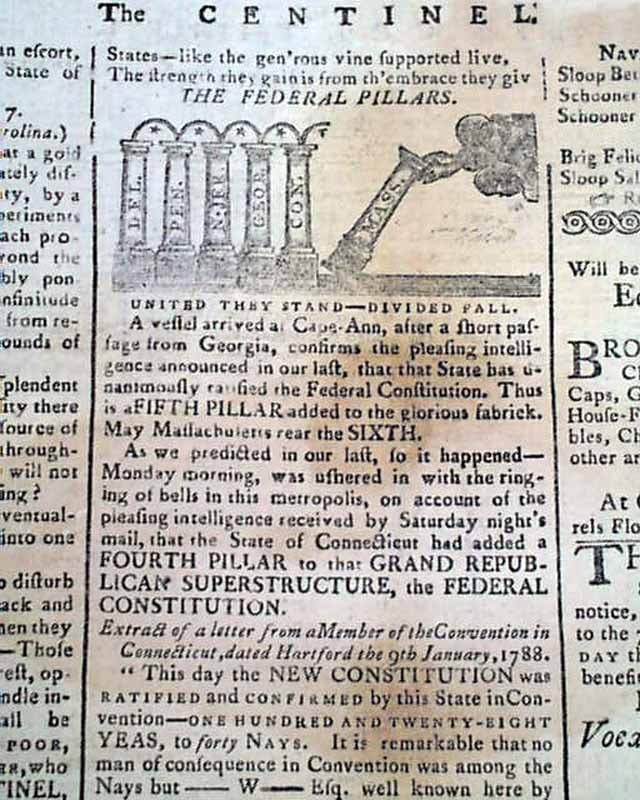 THE MASSACHUSETTS CENTINEL, Boston, January 16, 1788 This is one of the more desired & elusive issues of this title to be had, as it contains one of the cherished "pillar cartoons". The only other newspaper we have discovered that used the pillar cartoons is the Independent Chronicle, also from Boston.