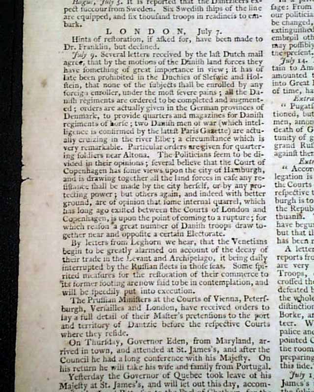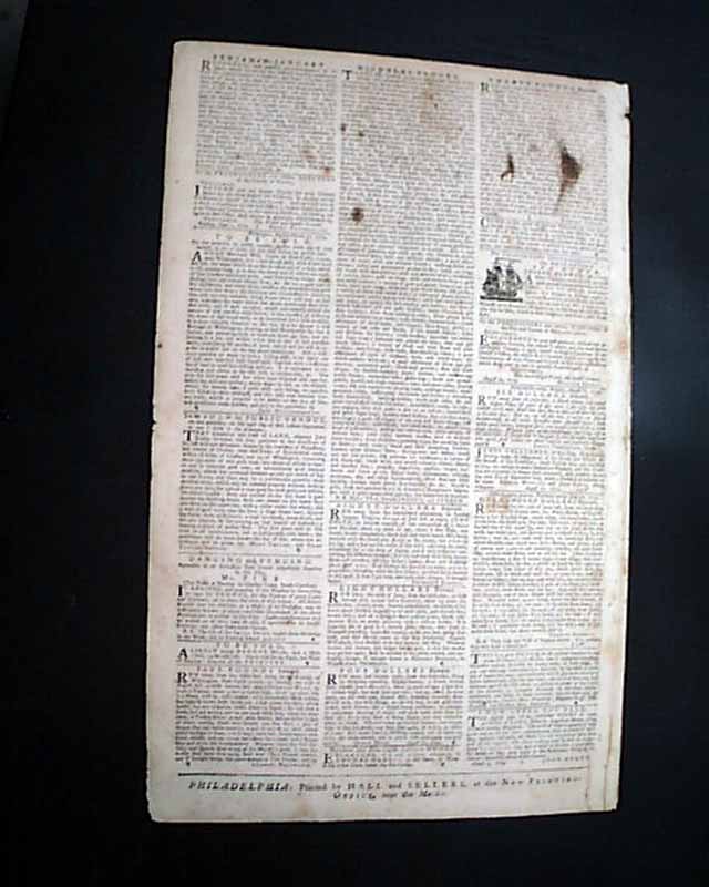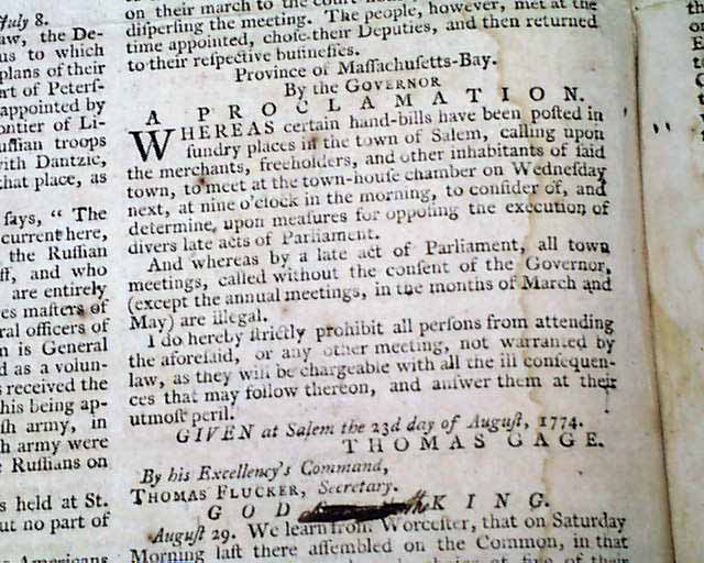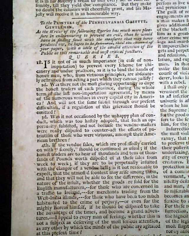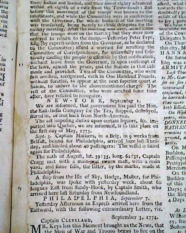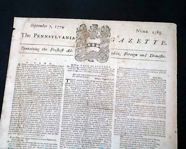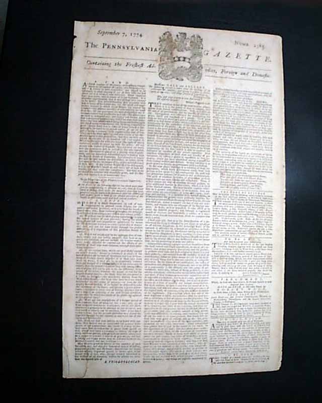 THE PENNSYLVANIA GAZETTE, Philadelphia, Sept. 7, 1774  A nice colonial newspaper once owned & printed by Ben Franklin, his imprint appearing on the newspaper through 1765.