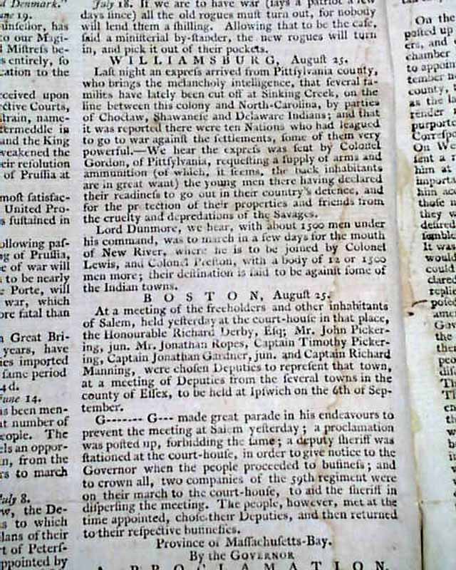 Page 2 has a brief report from London: "Hints of restoration, if asked for, have been made to Dr. Franklin, but declined." Page 2 also has a report from Williamsburg concerning the killing of settlers in the Carolinas by Choctaw, Shawanese & Delaware Indians.